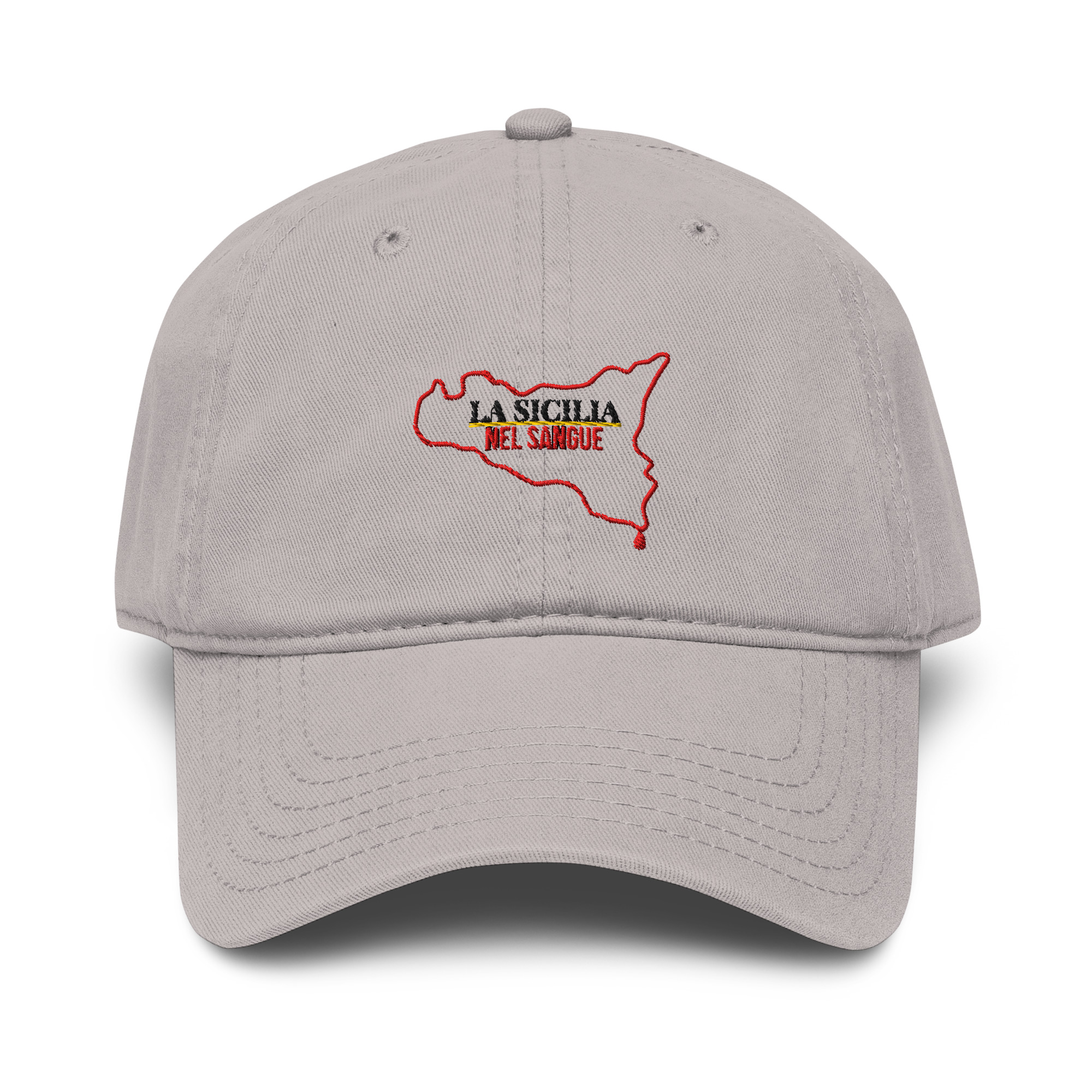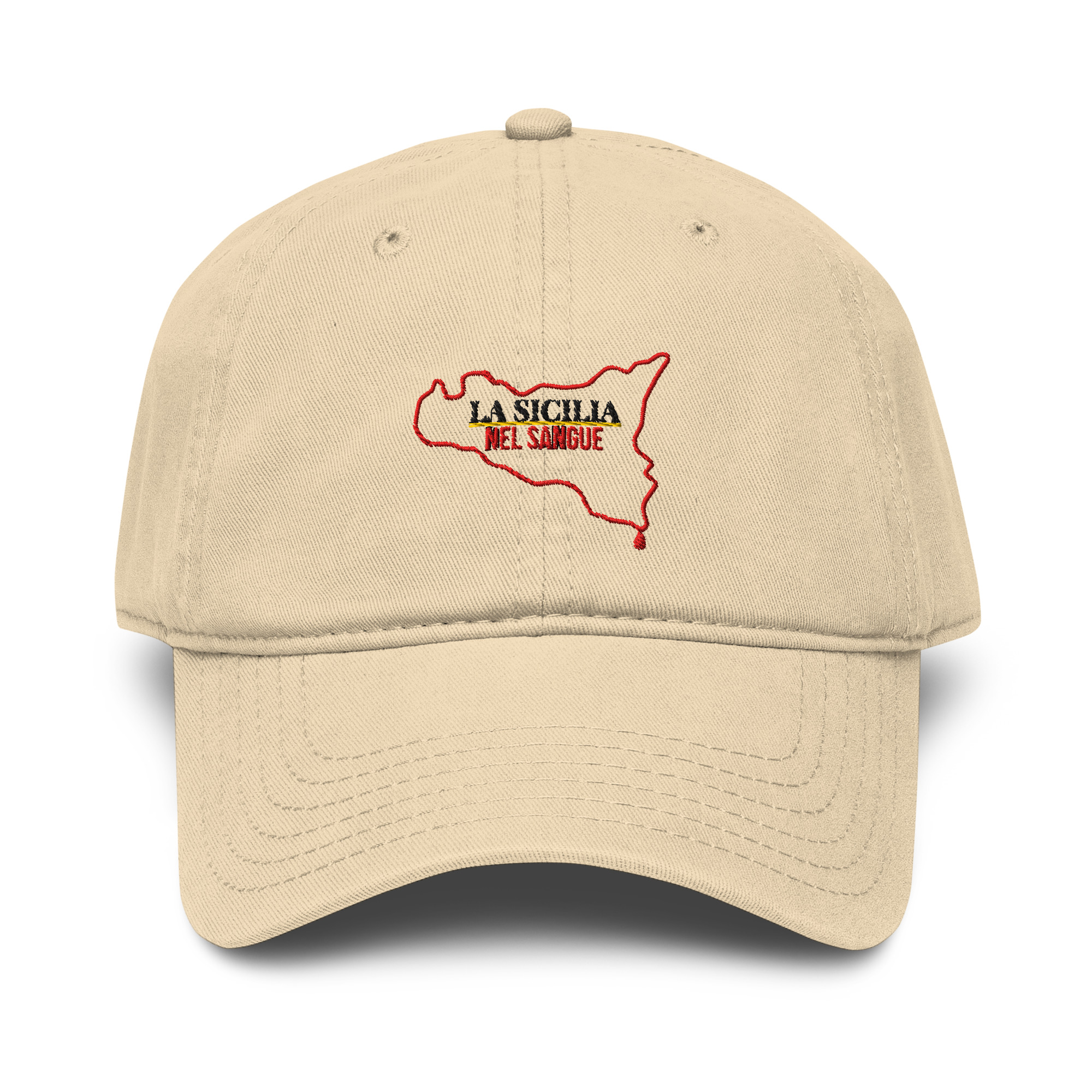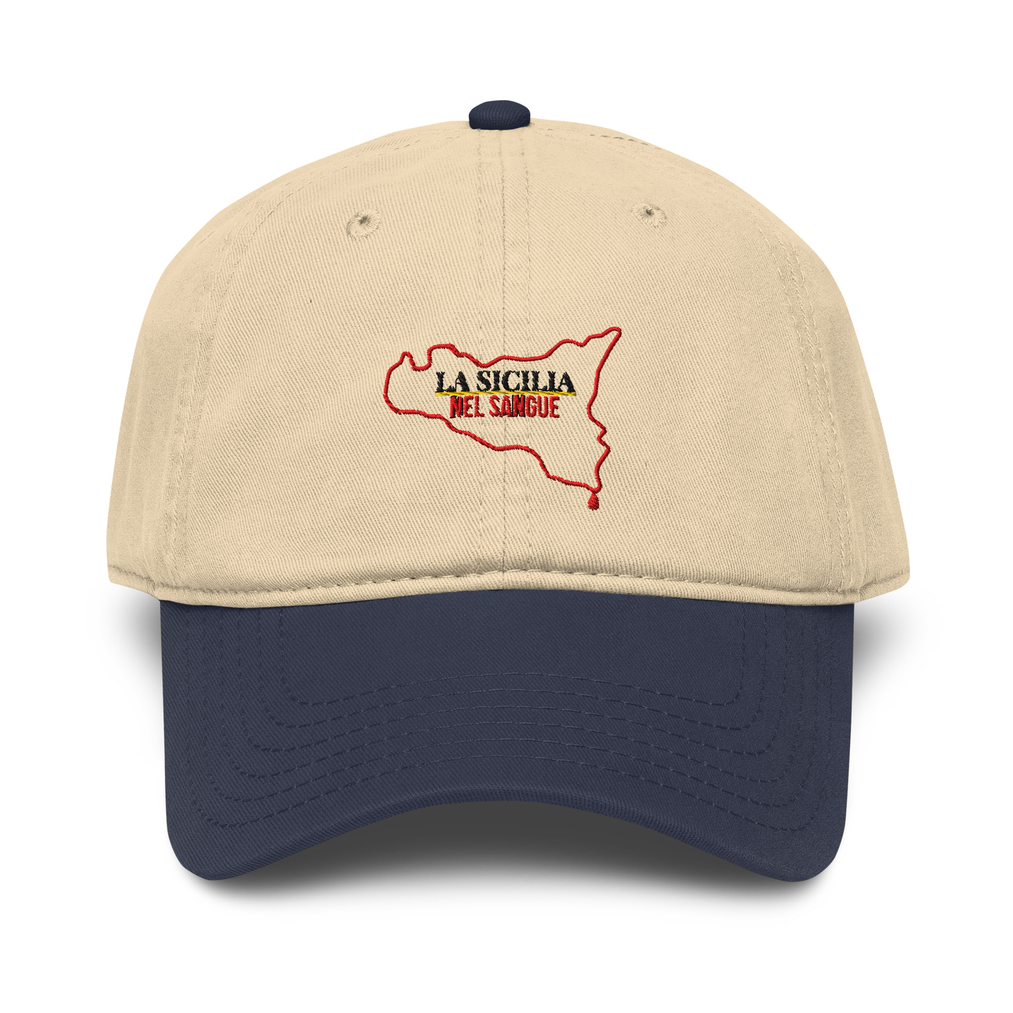 Non una stampa che svanisce. Filo intrecciato nella struttura: permanente, tattile, vivo sotto le dita. Come il legame con la propria terra. Perché la Sicilia non si porta solo nel cuore o sulle spalle: si porta in testa, dove nascono i pensieri, i ricordi e la visione del mondo. Ogni sguardo che lanci da sotto quella visiera è filtrato dalla cultura di una terra millenaria che ti ha formato il carattere prima ancora delle parole.