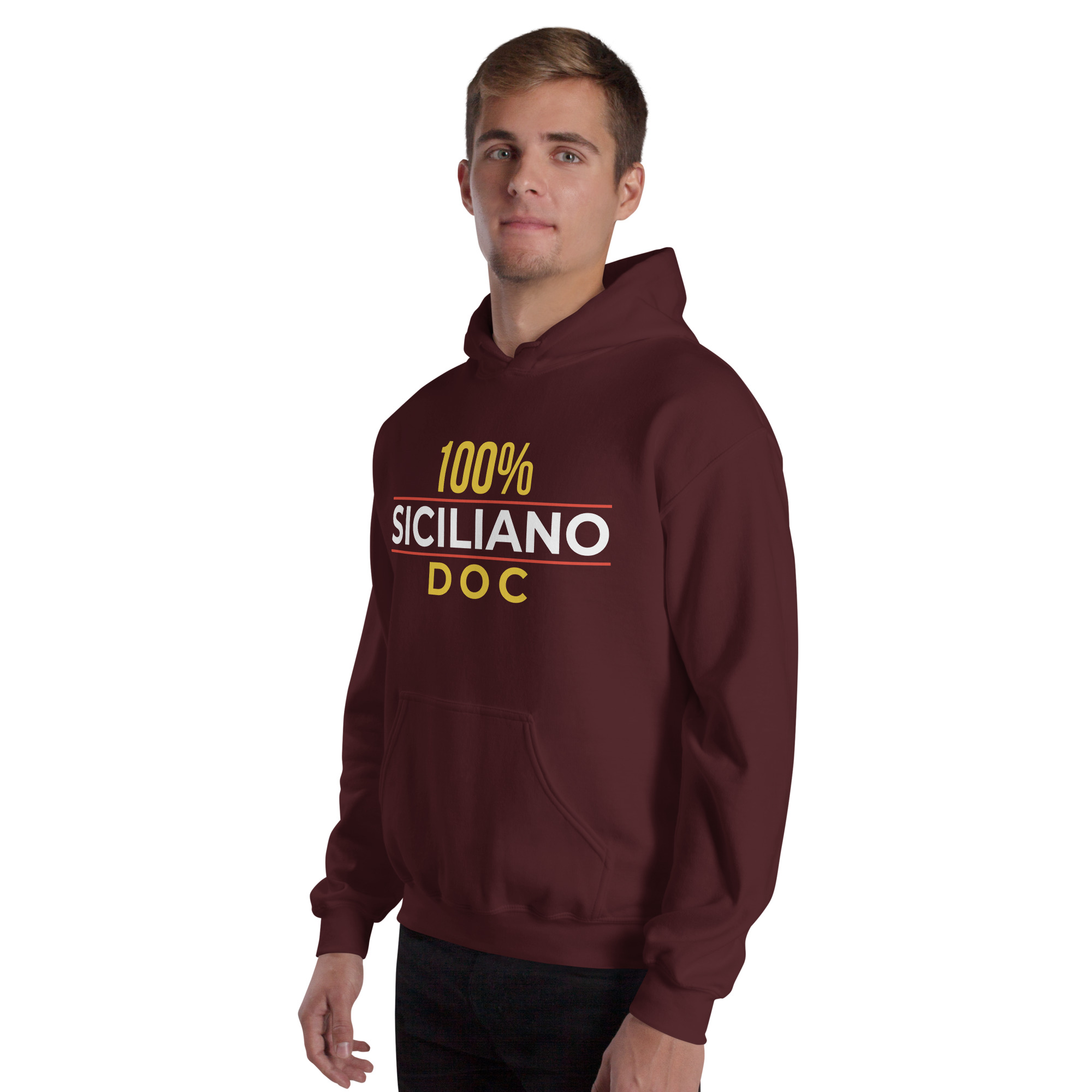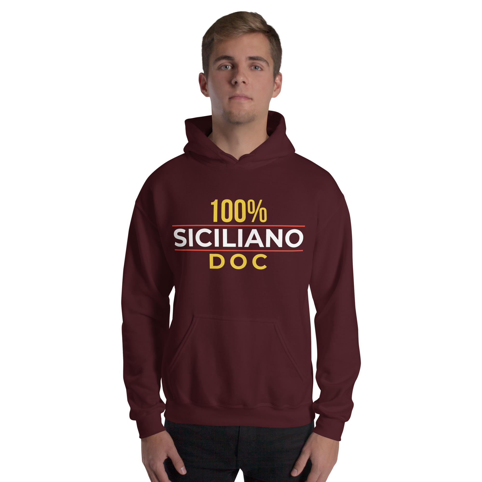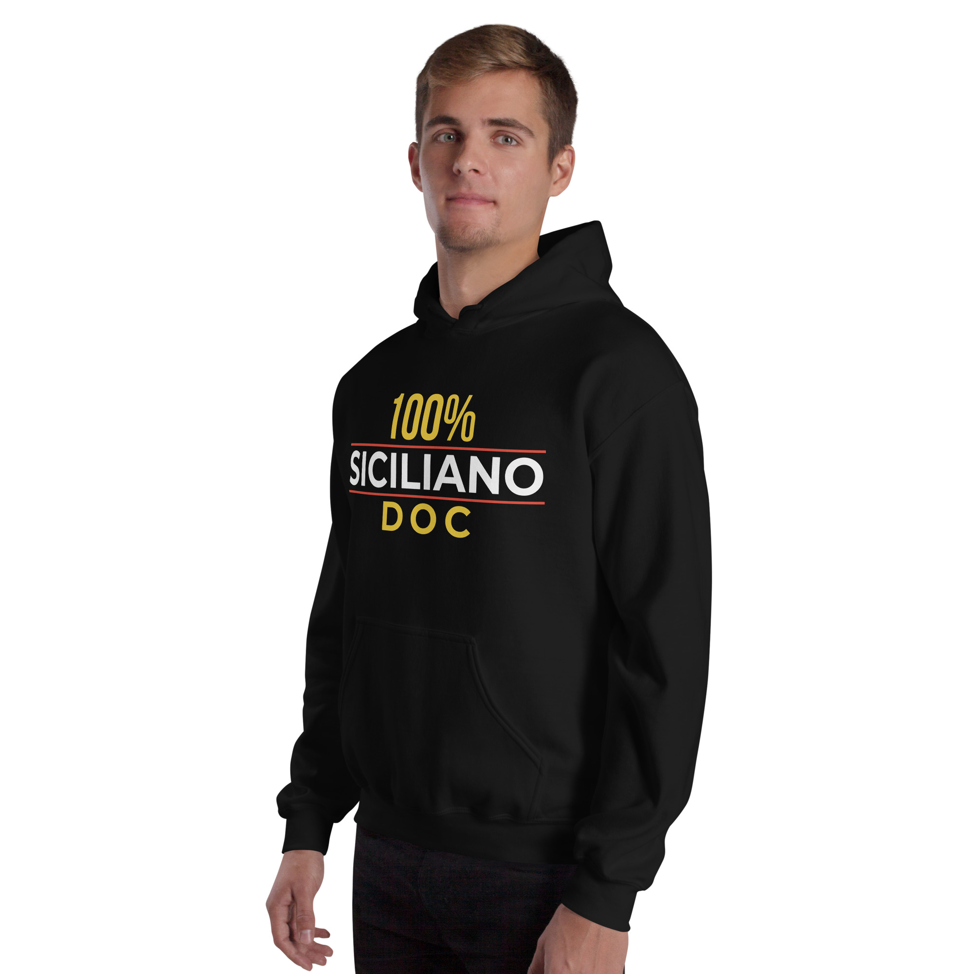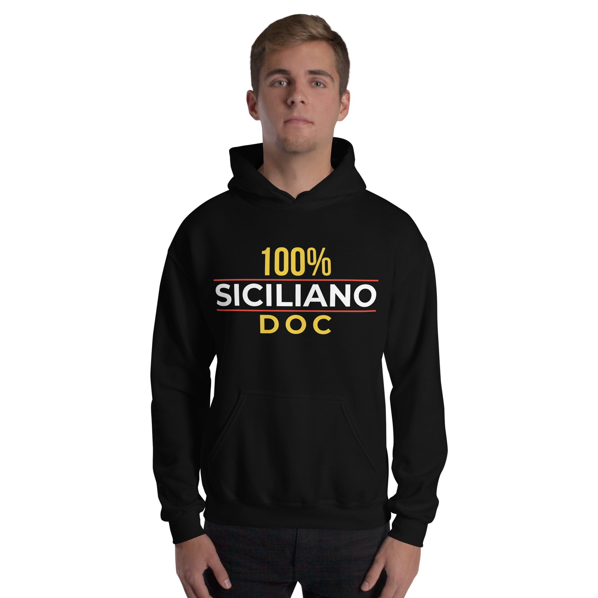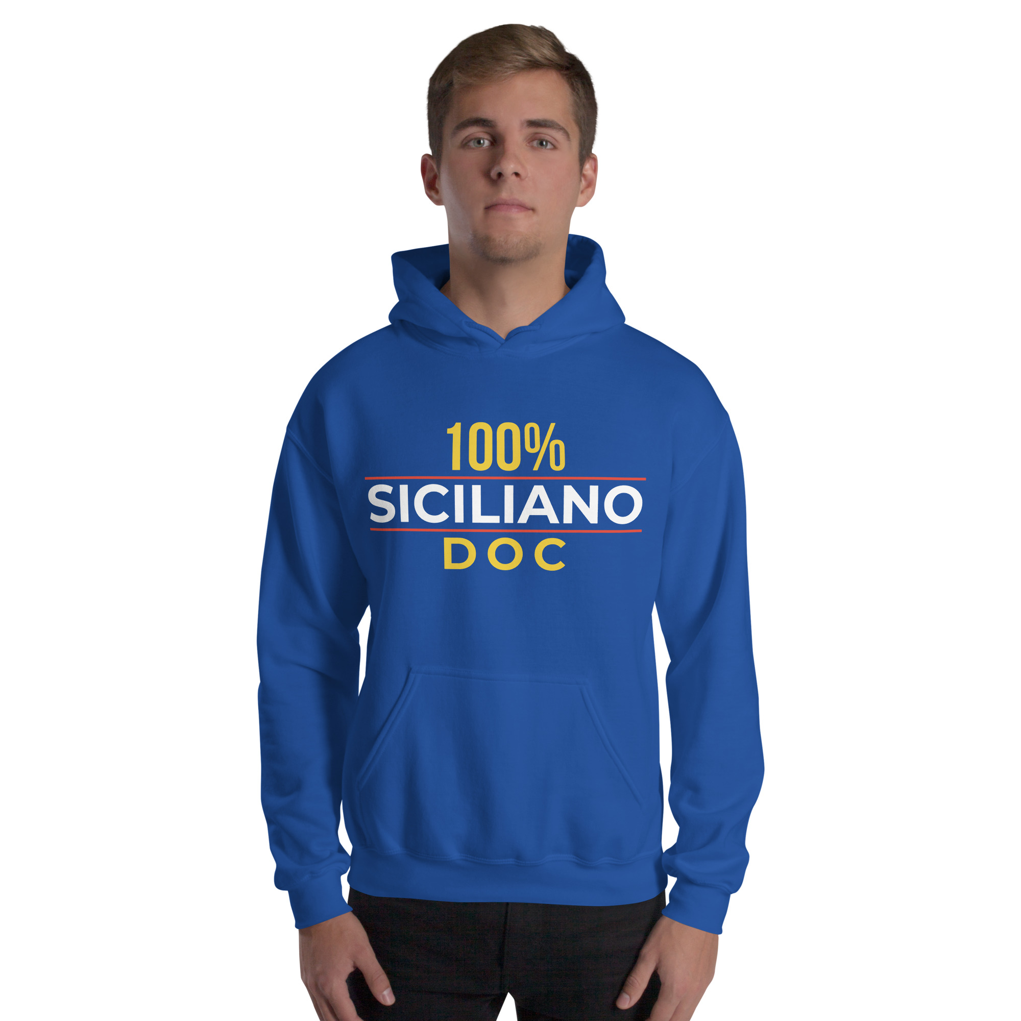 Sul petto, al centro esatto, la scritta “100% Siciliano DOC”.