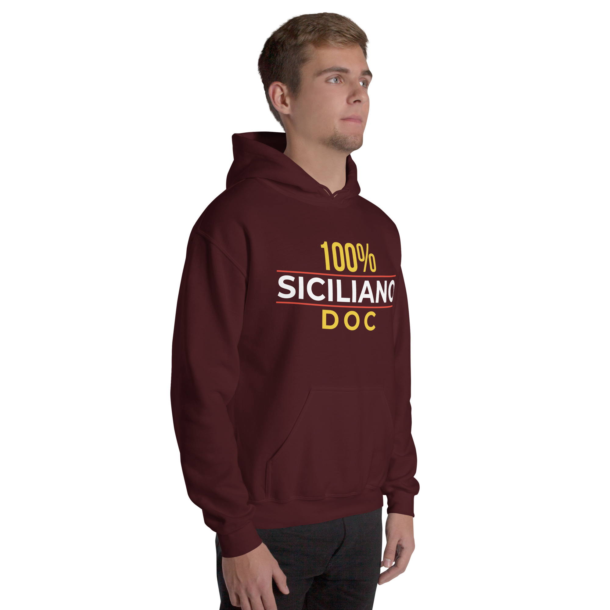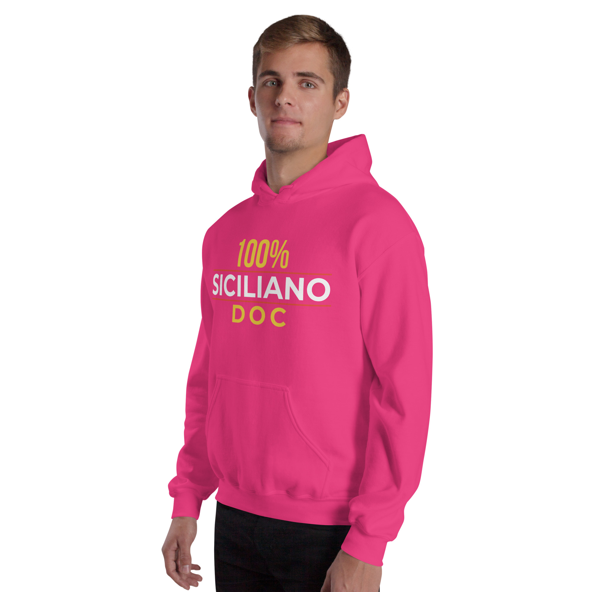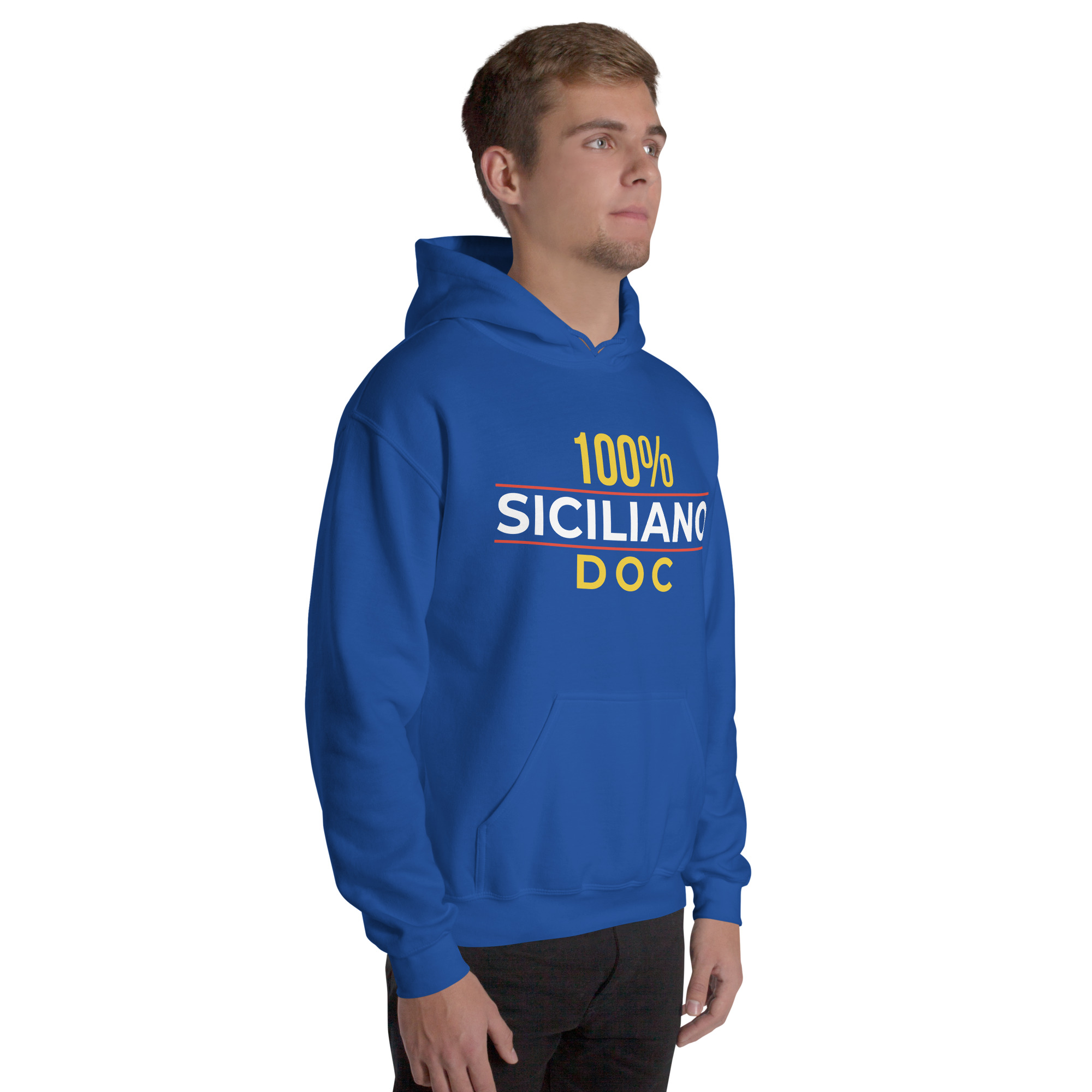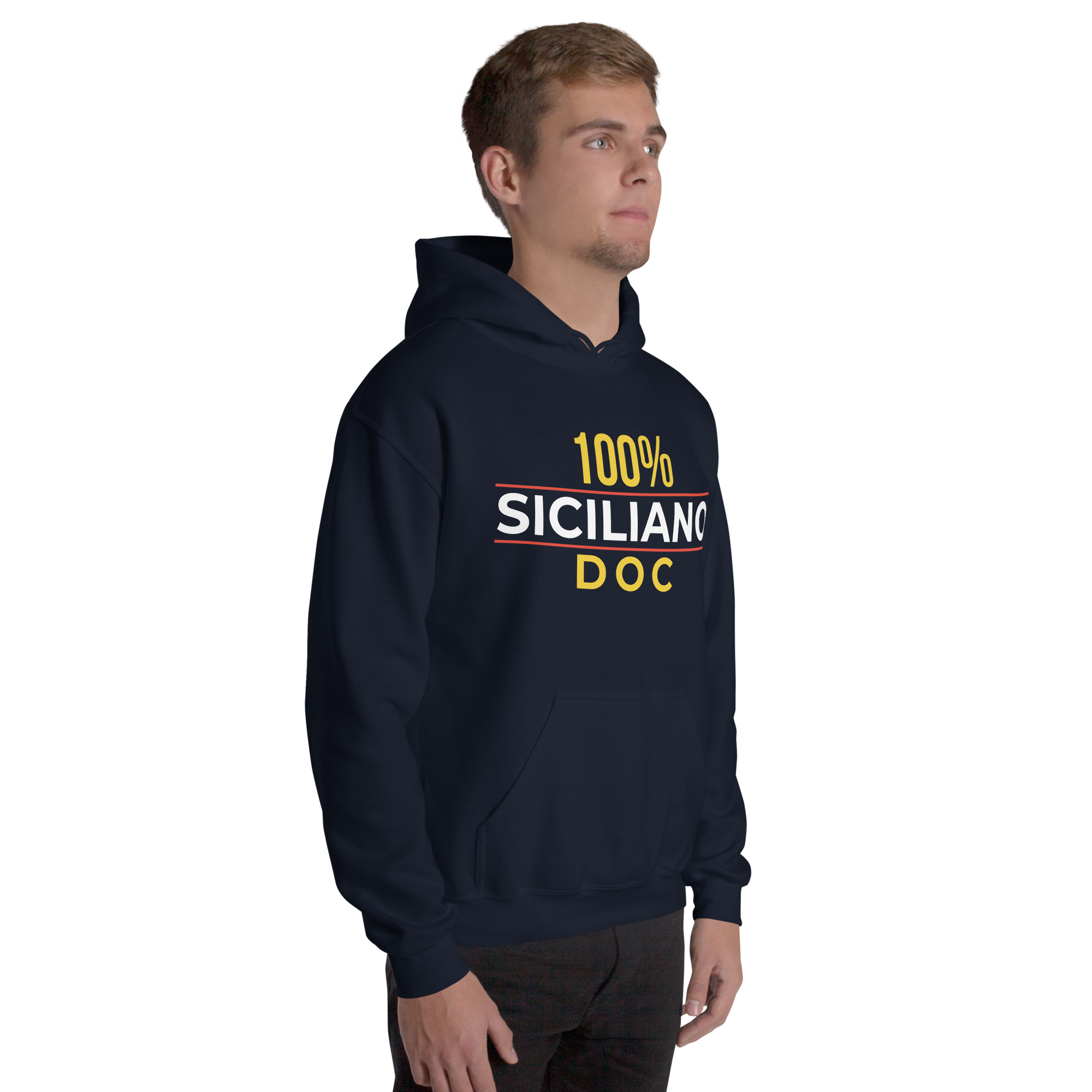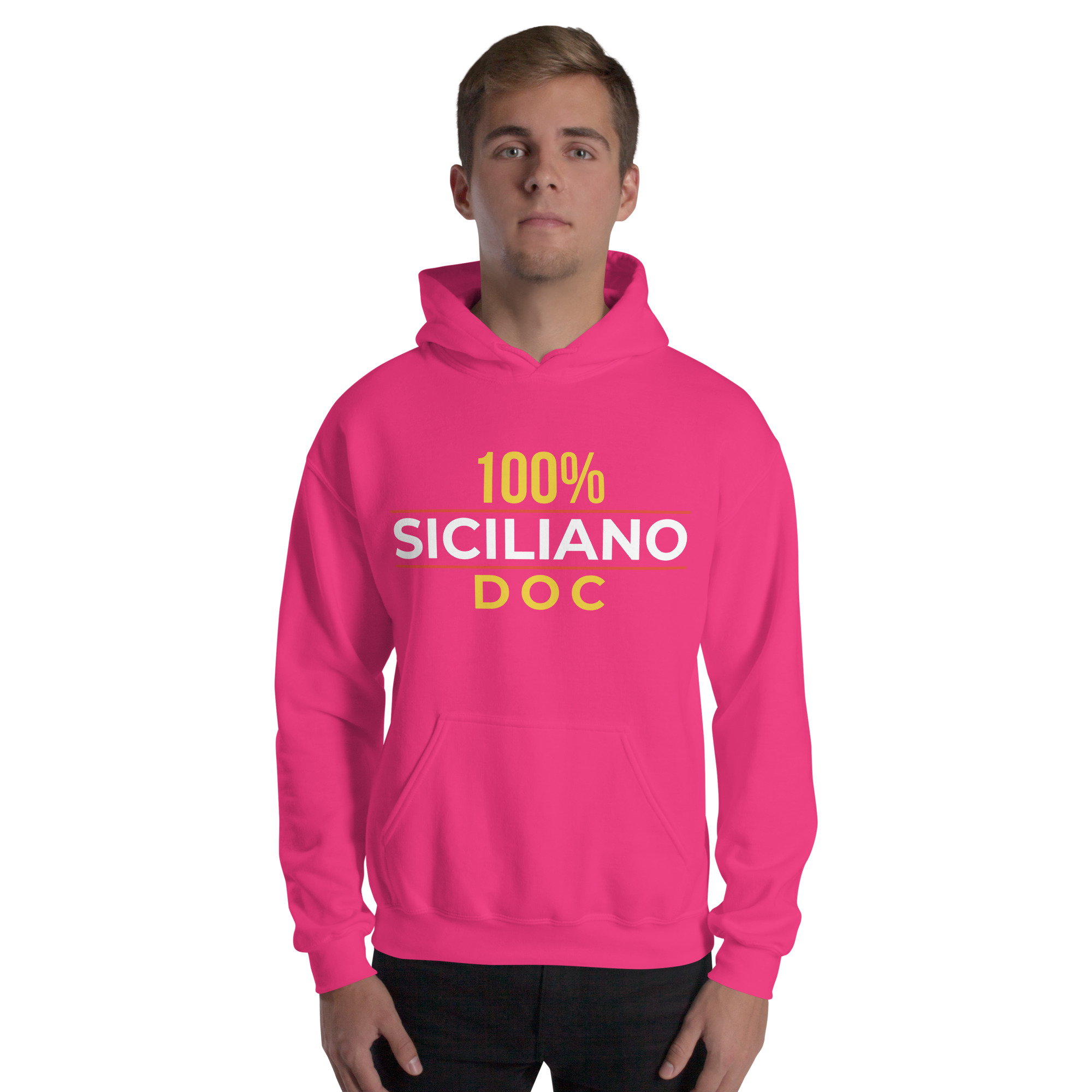 Sul petto, al centro esatto, la scritta “100% Siciliano DOC”.