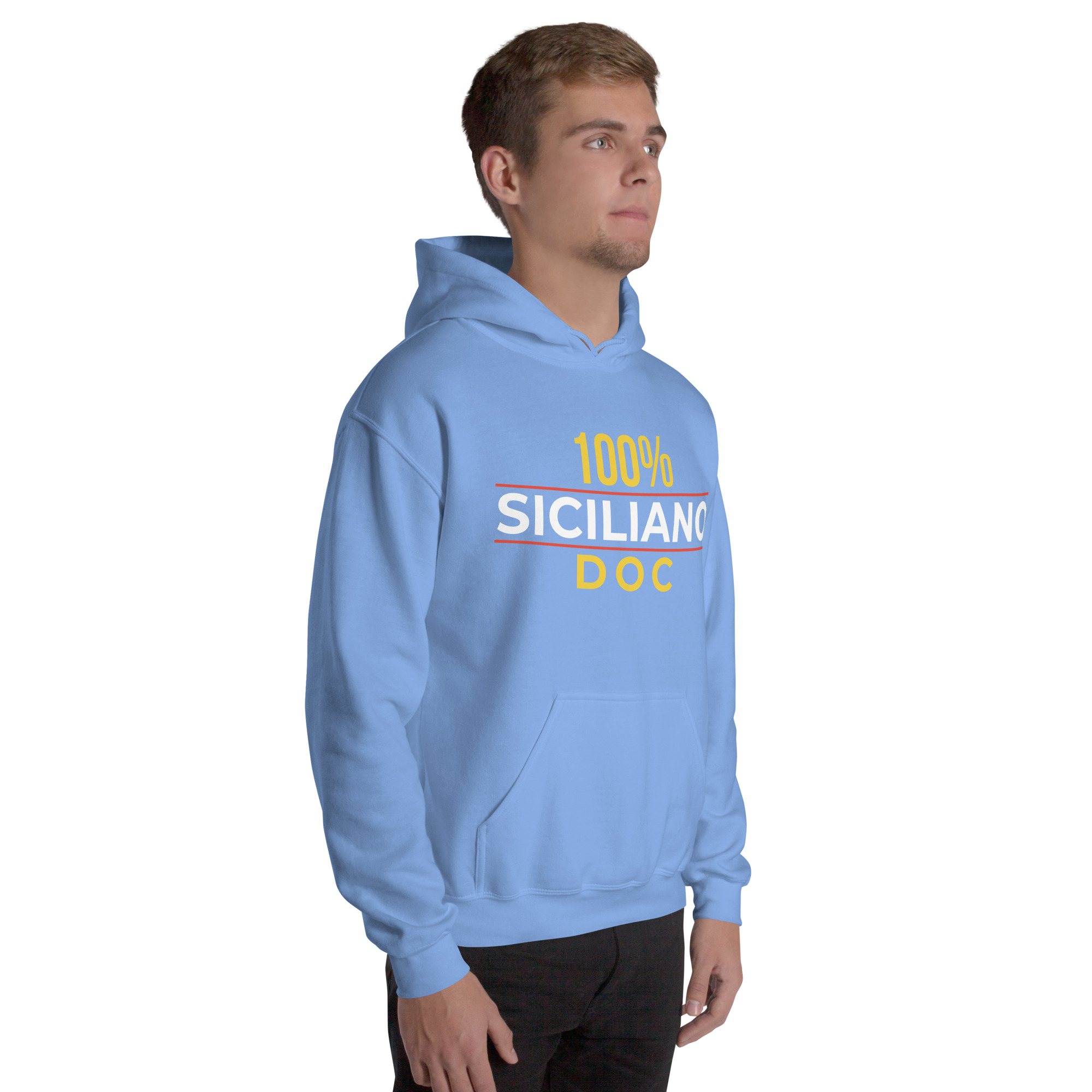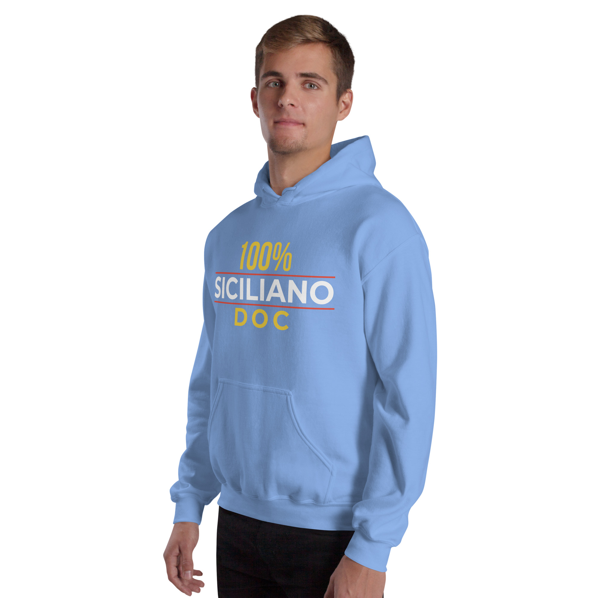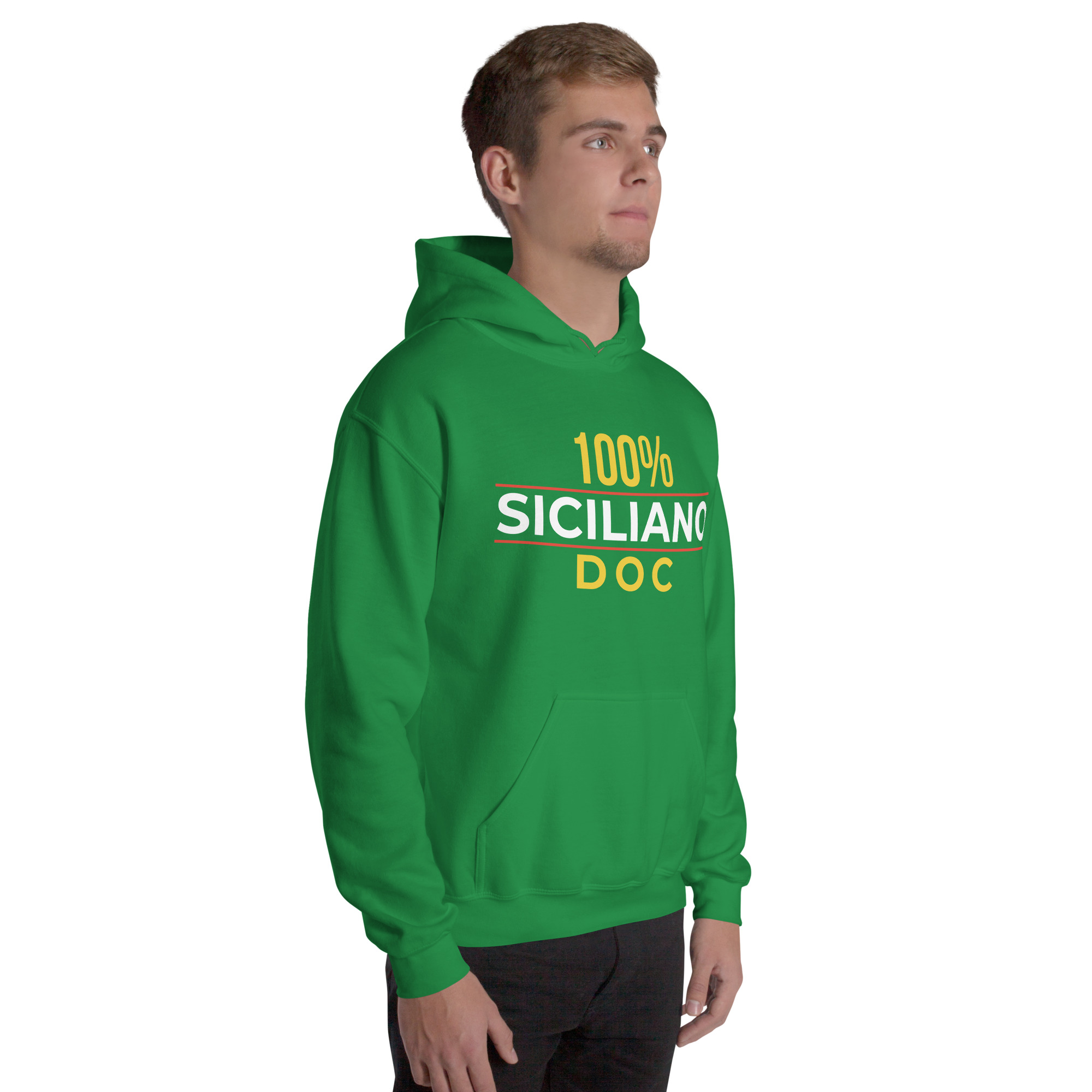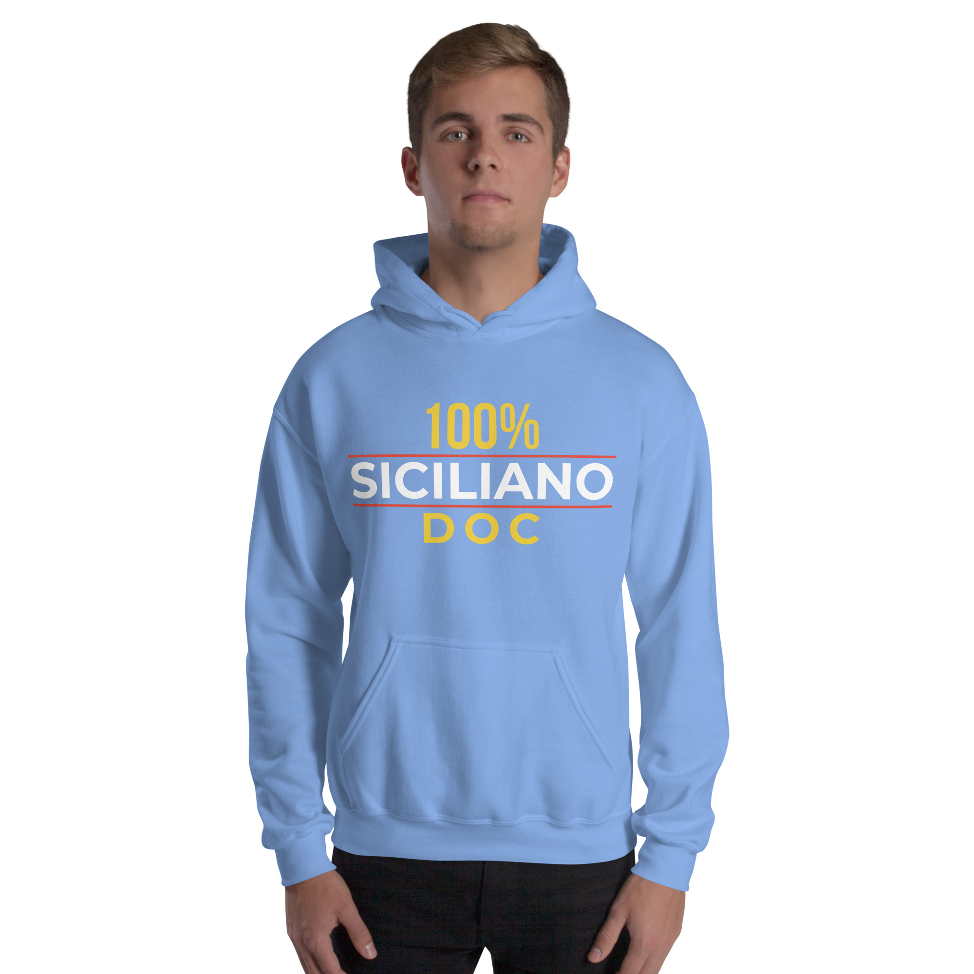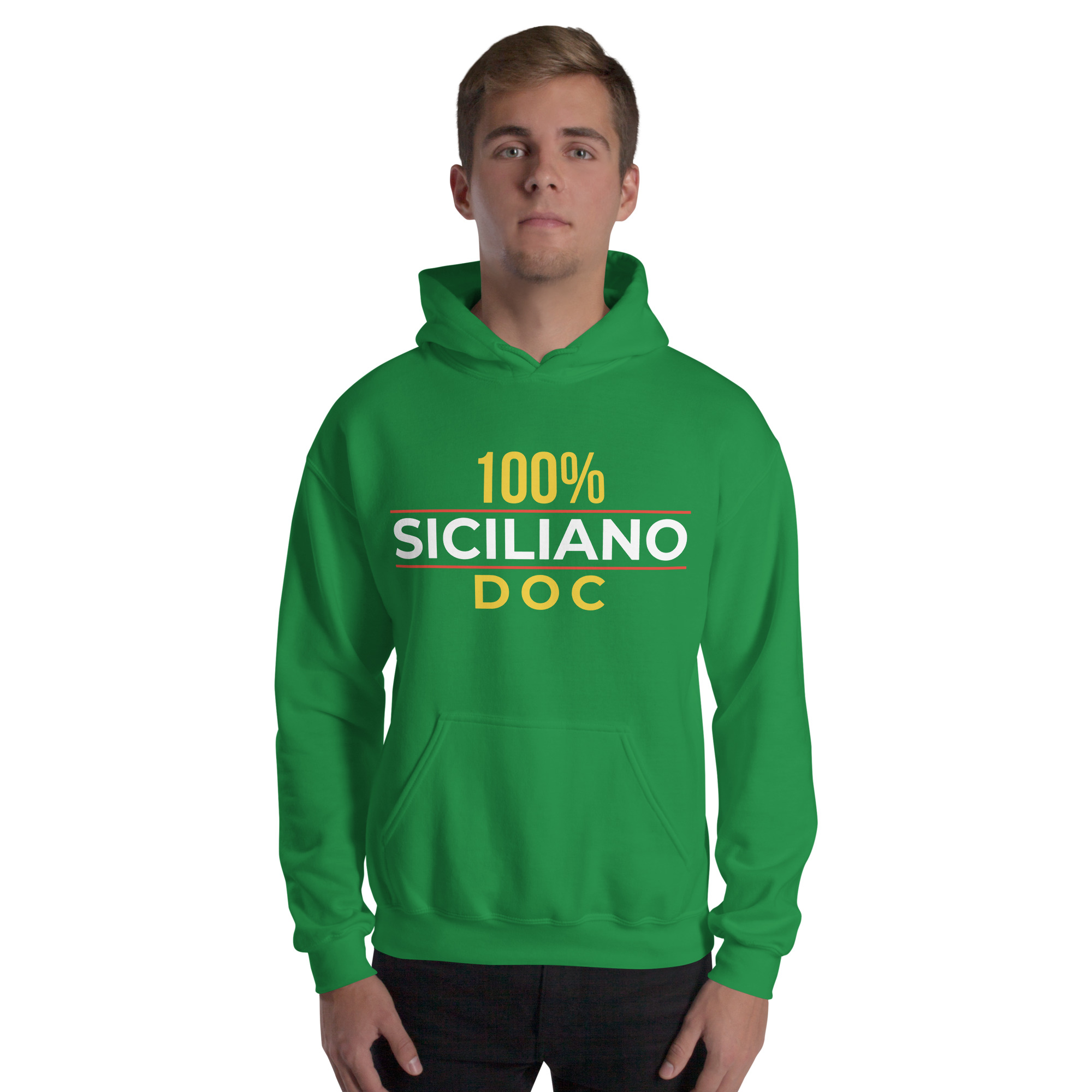 Sul petto, al centro esatto, la scritta “100% Siciliano DOC”.