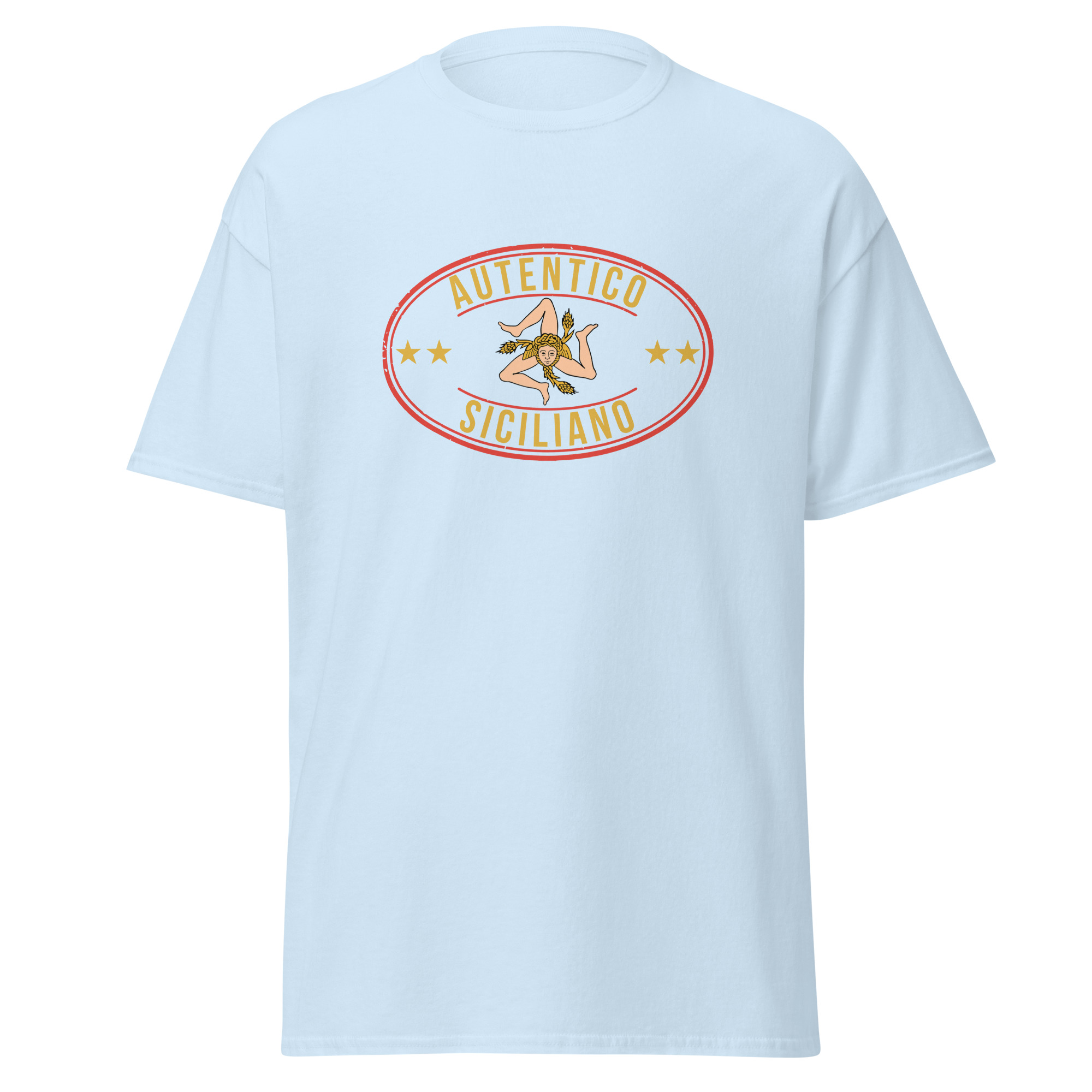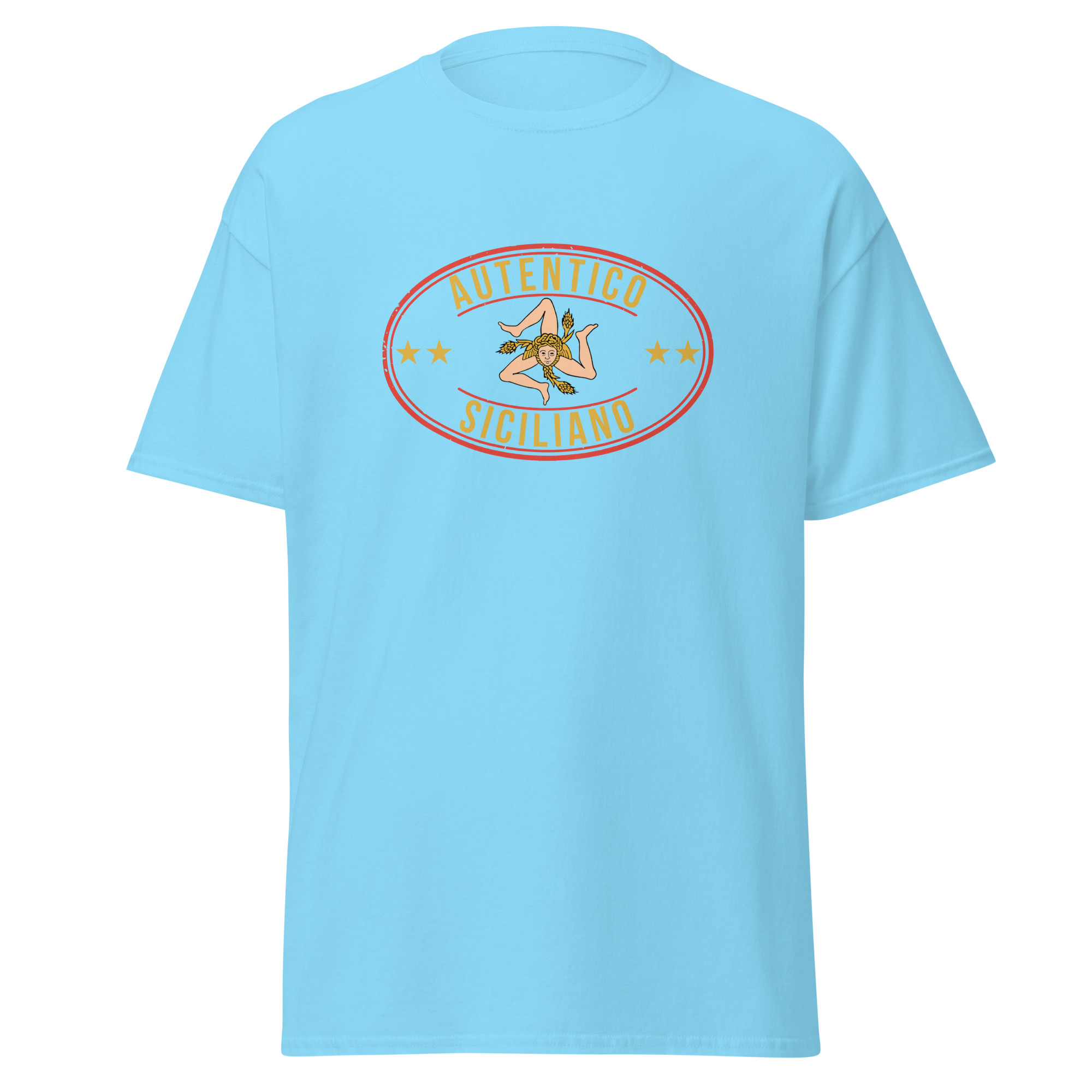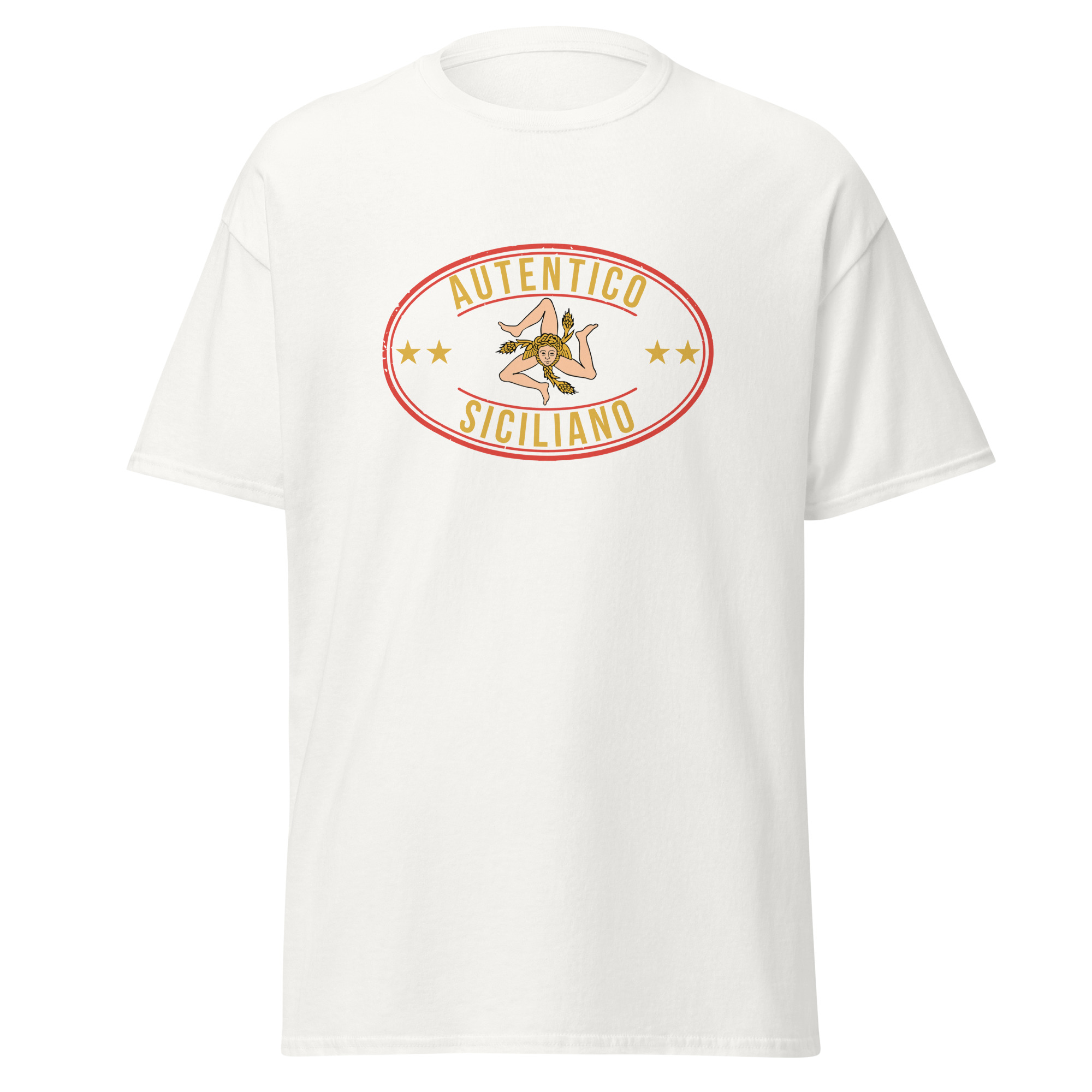 Al centro del petto, il logo “Autentico Siciliano” si fonde con la Trinacria: il simbolo più antico e potente della nostra isola. Tre gambe che corrono senza fermarsi mai, come il popolo siciliano. Il volto della Medusa che non pietrifica ma protegge. Le spighe di grano che raccontano la fertilità di una terra generosa da millenni. Non è un disegno folkloristico da souvenir turistico: è il sigillo di una civiltà che ha attraversato Fenici, Greci, Arabi, Normanni e Spagnoli prendendo il meglio da ognuno senza mai perdere se stessa.