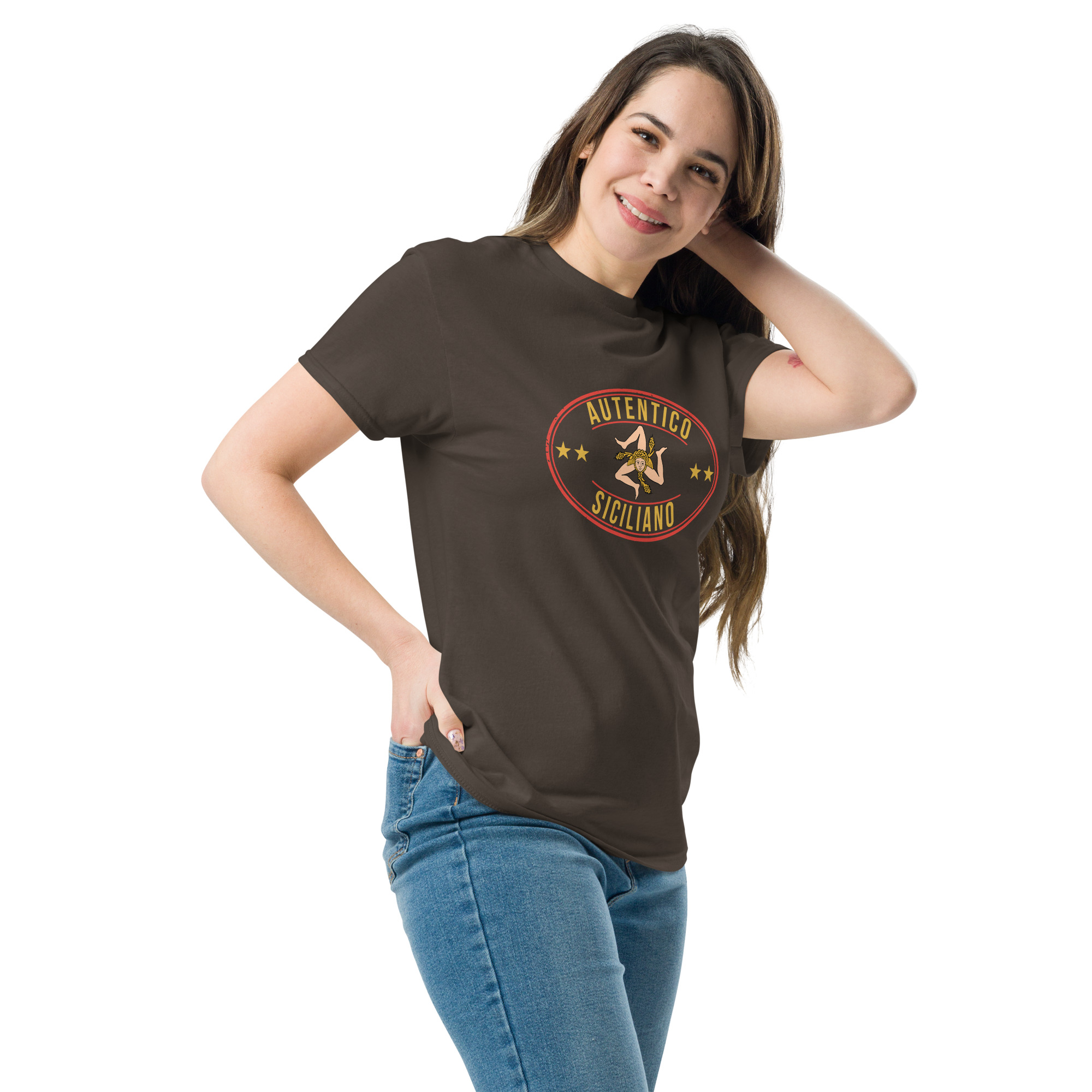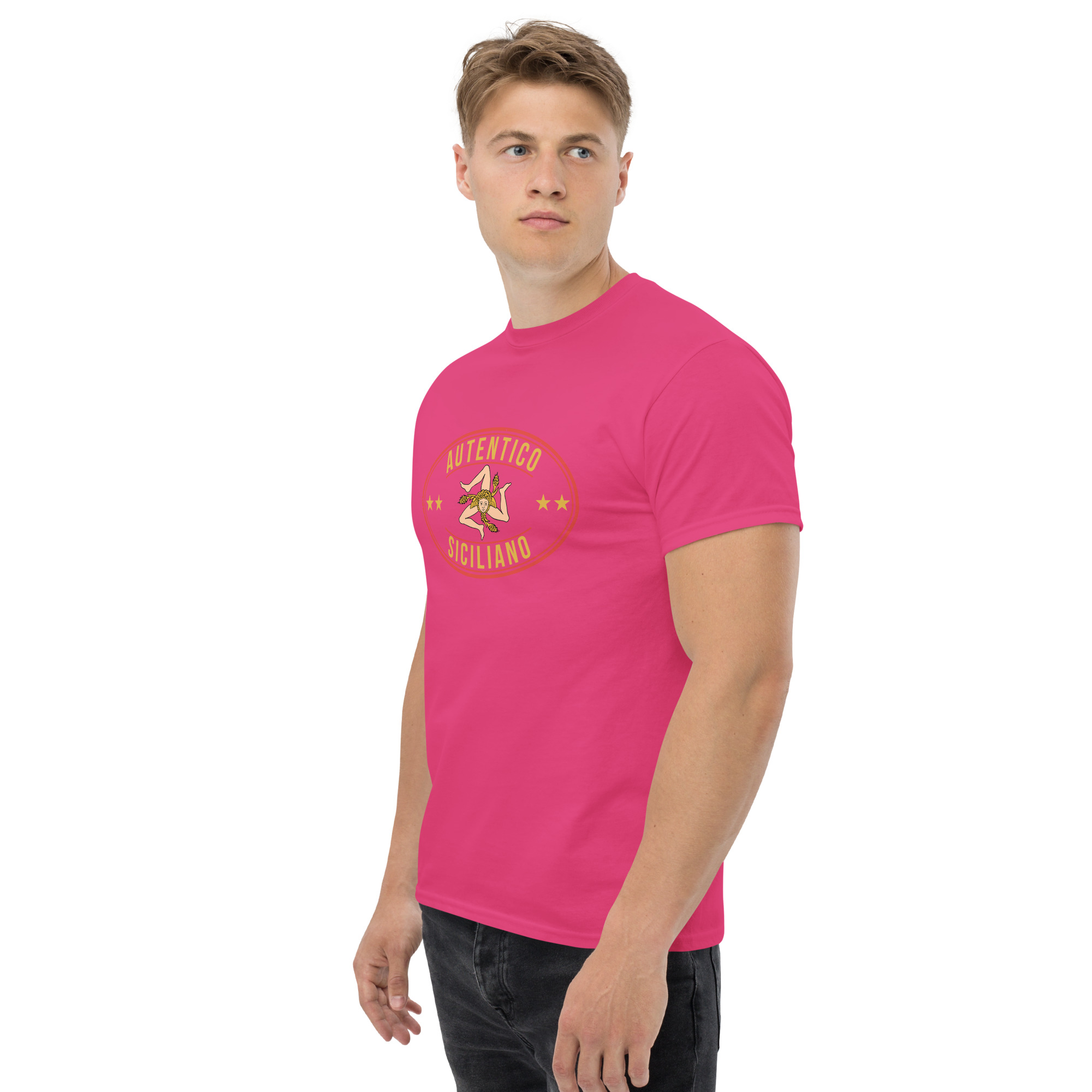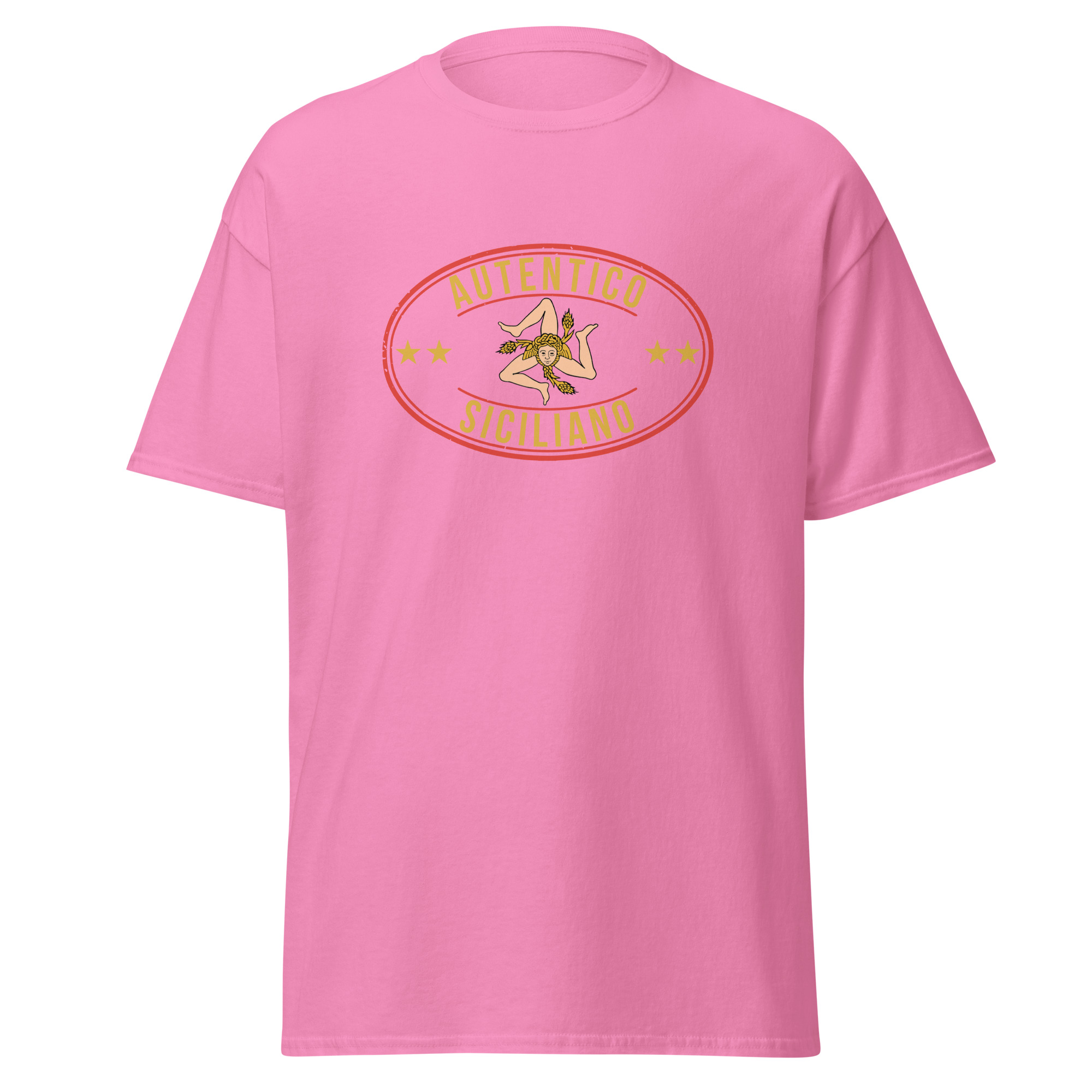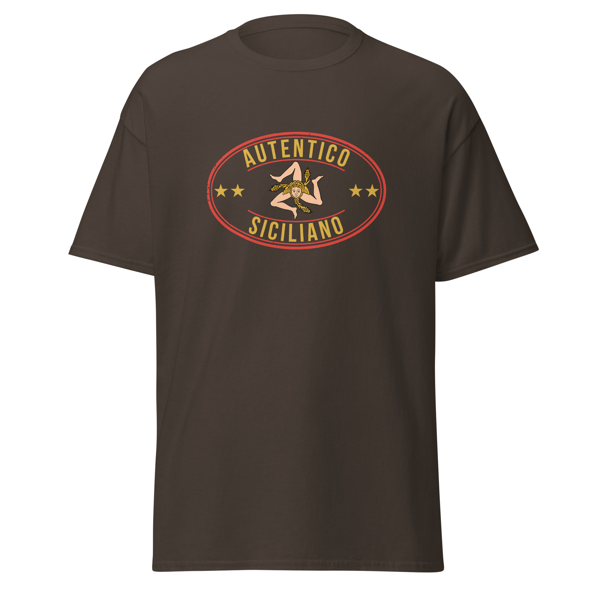 Al centro del petto, il logo “Autentico Siciliano” si fonde con la Trinacria: il simbolo più antico e potente della nostra isola. Tre gambe che corrono senza fermarsi mai, come il popolo siciliano. Il volto della Medusa che non pietrifica ma protegge. Le spighe di grano che raccontano la fertilità di una terra generosa da millenni. Non è un disegno folkloristico da souvenir turistico: è il sigillo di una civiltà che ha attraversato Fenici, Greci, Arabi, Normanni e Spagnoli prendendo il meglio da ognuno senza mai perdere se stessa.