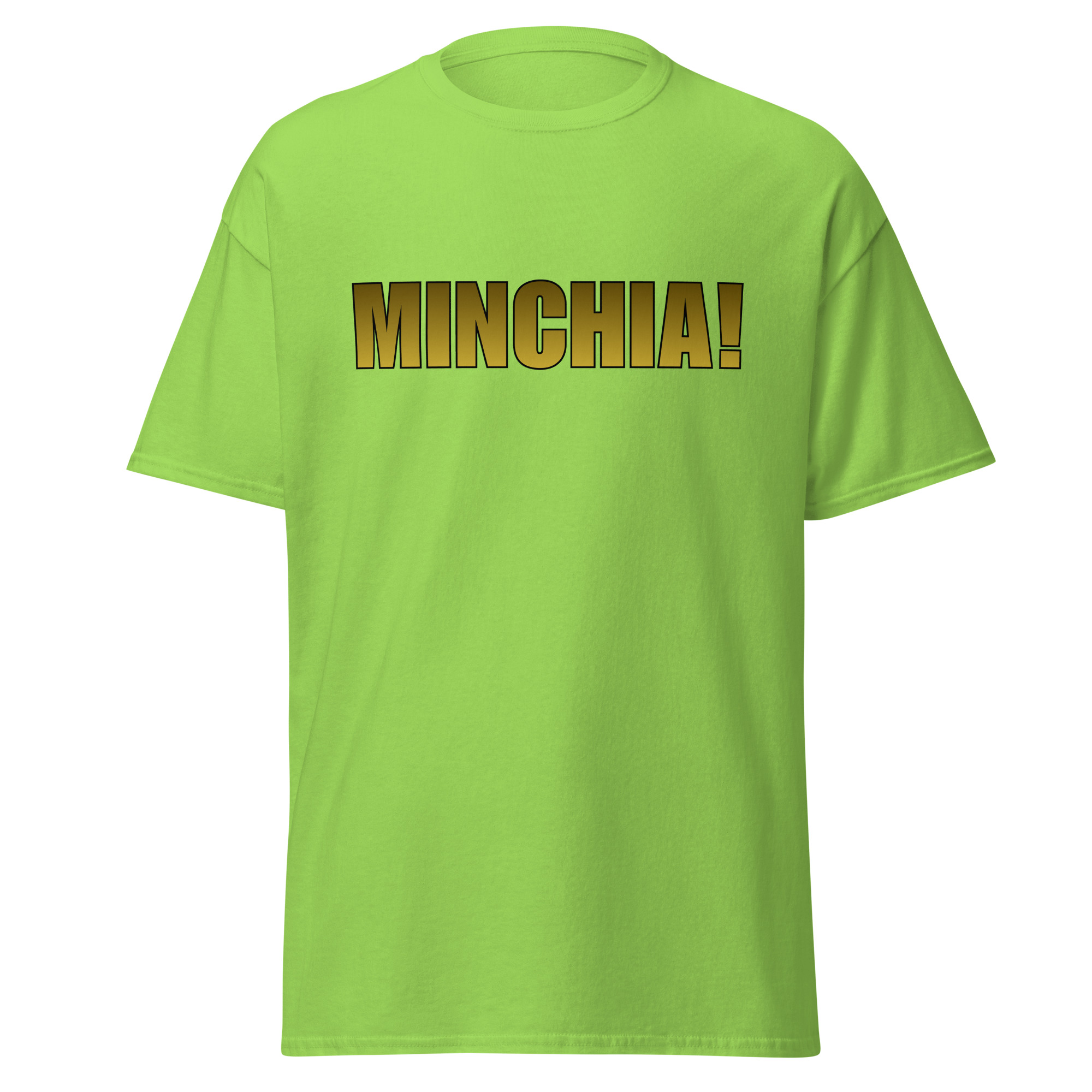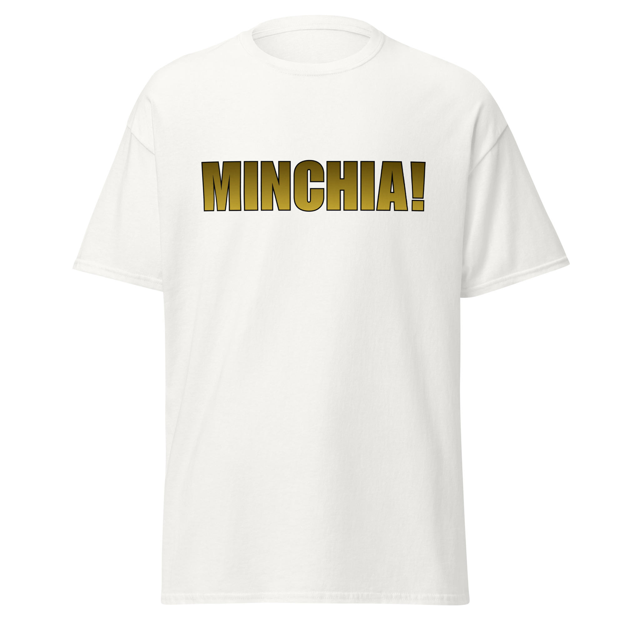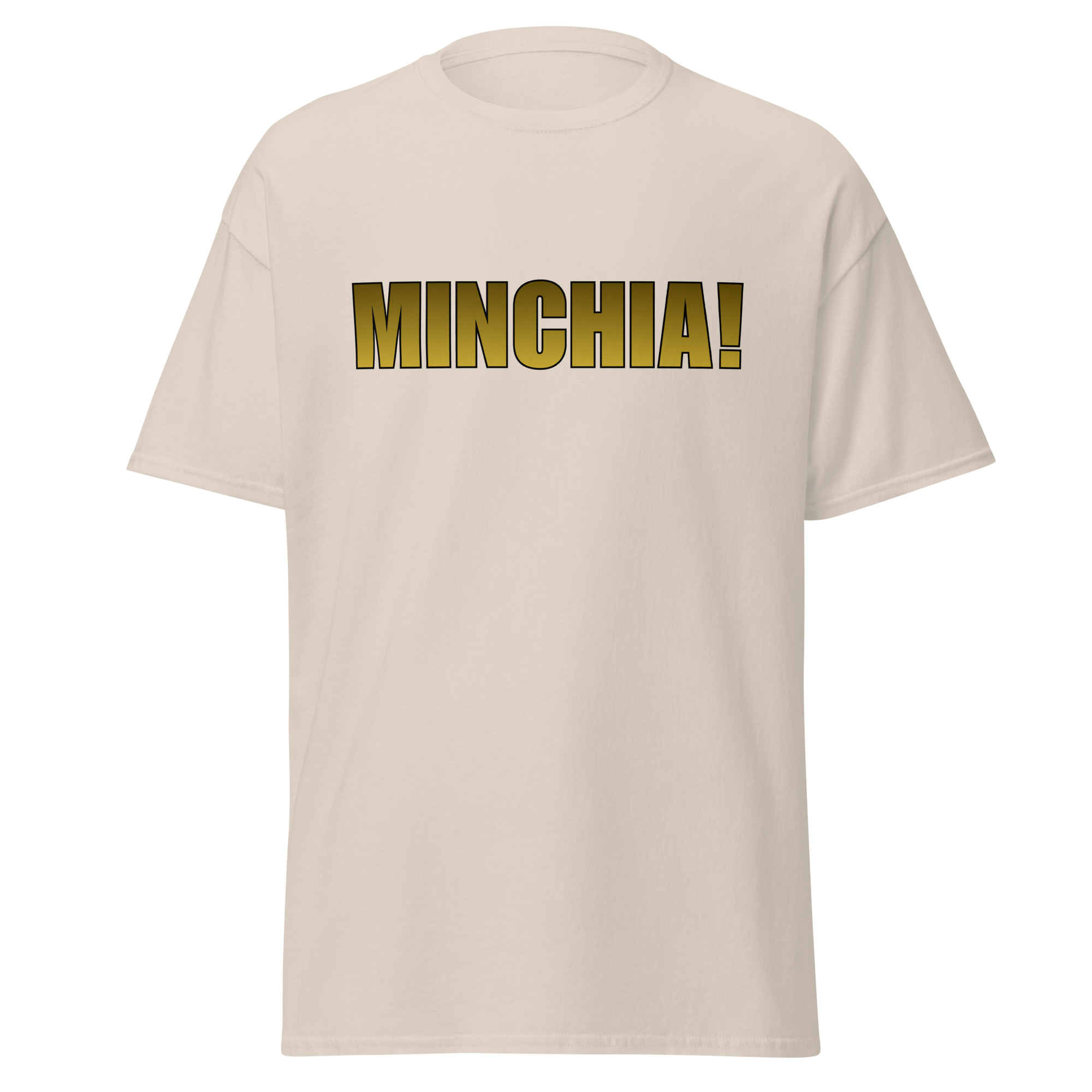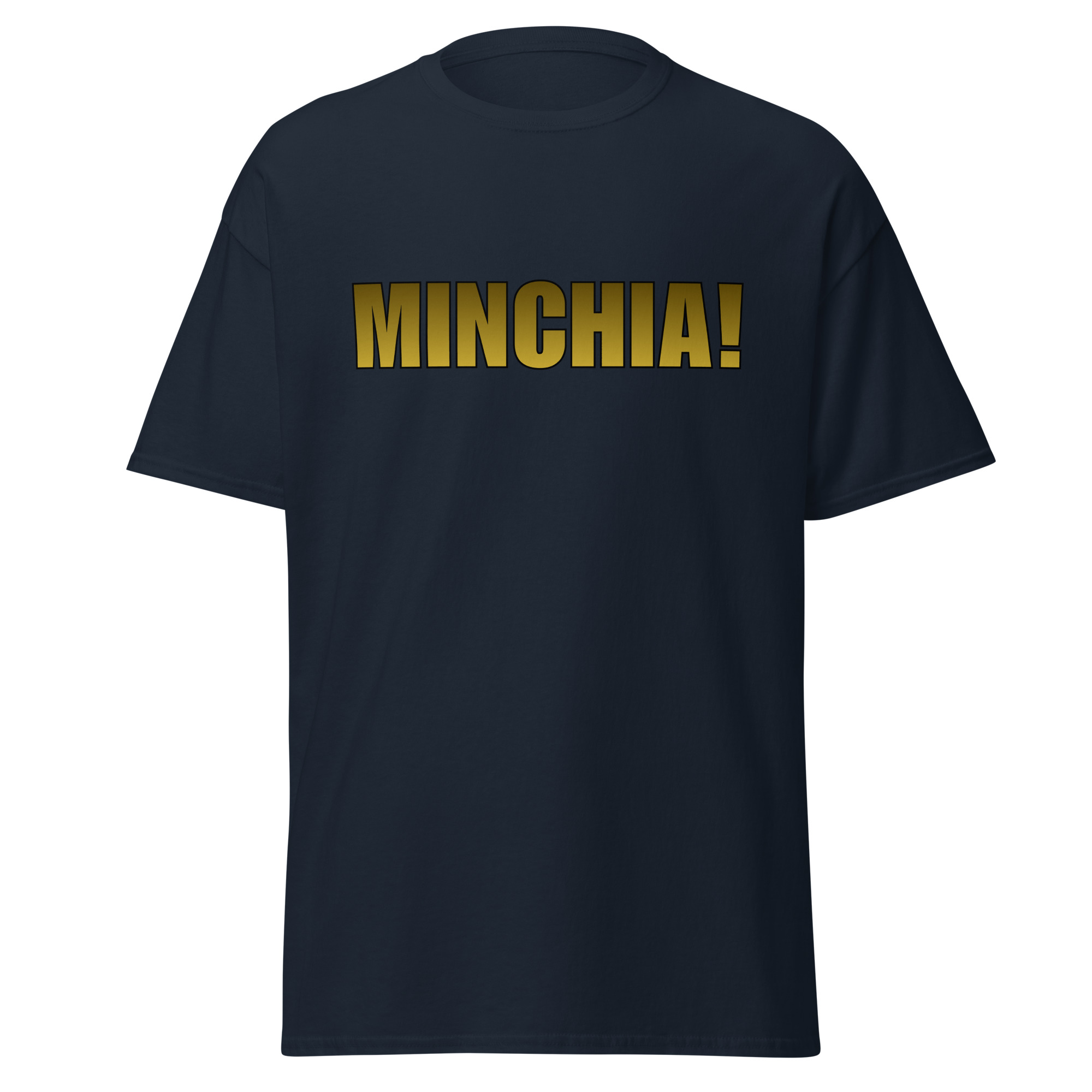 Sul petto, stampata con fierezza e senza censure, l’esclamazione “MINCHIA!”.