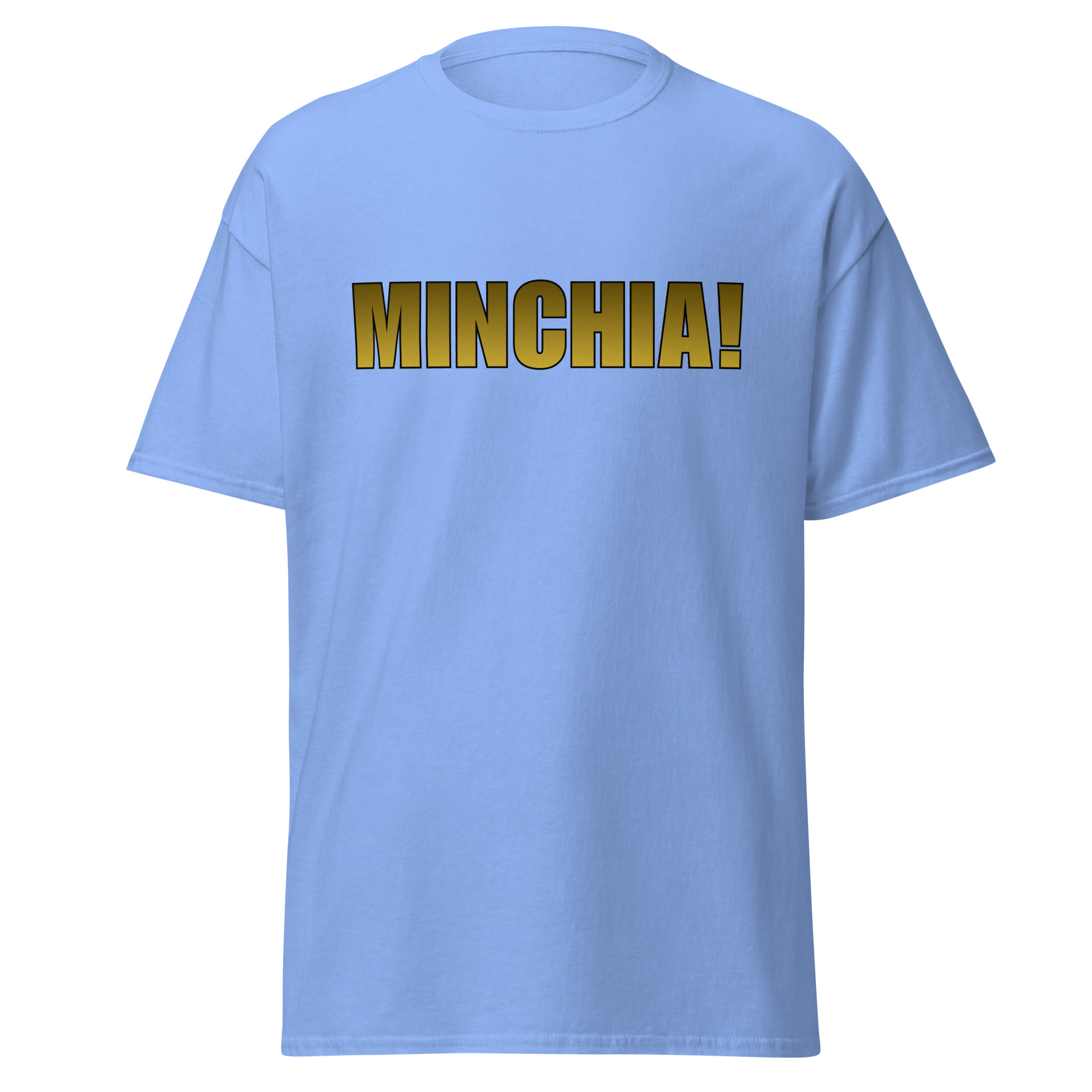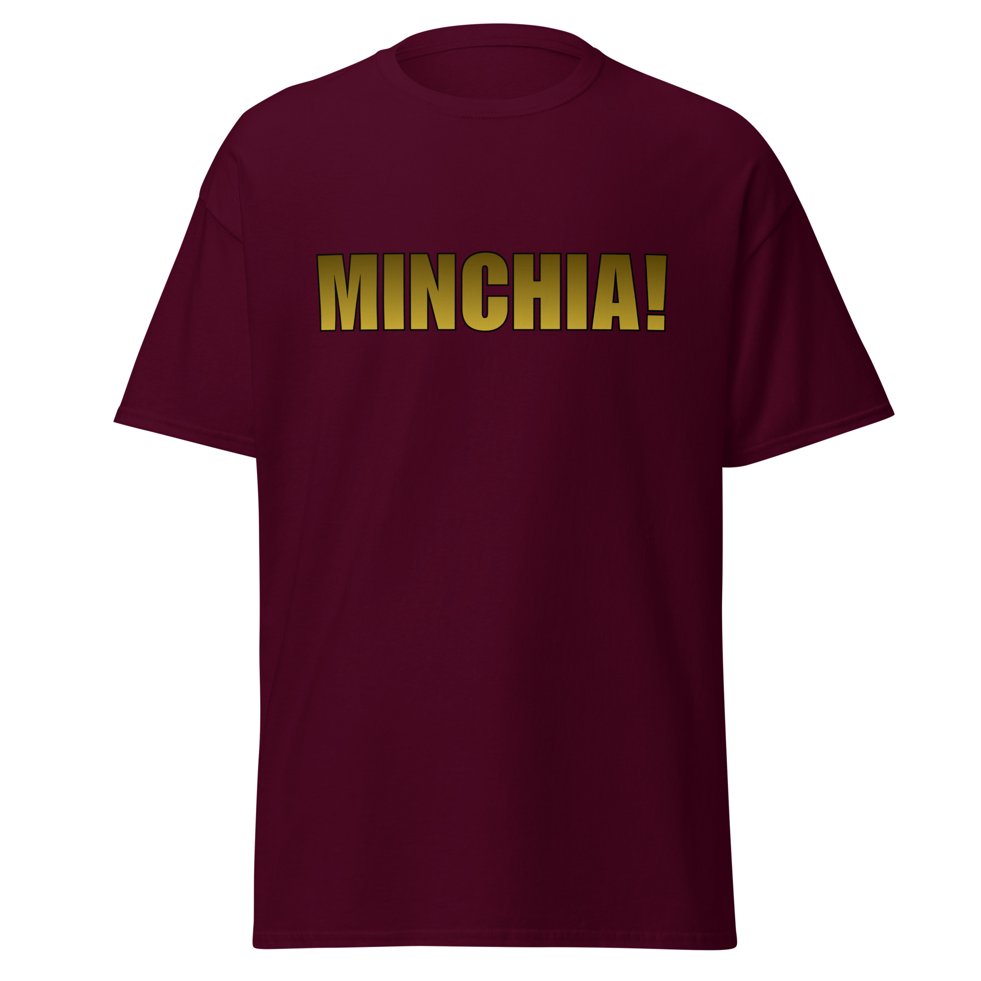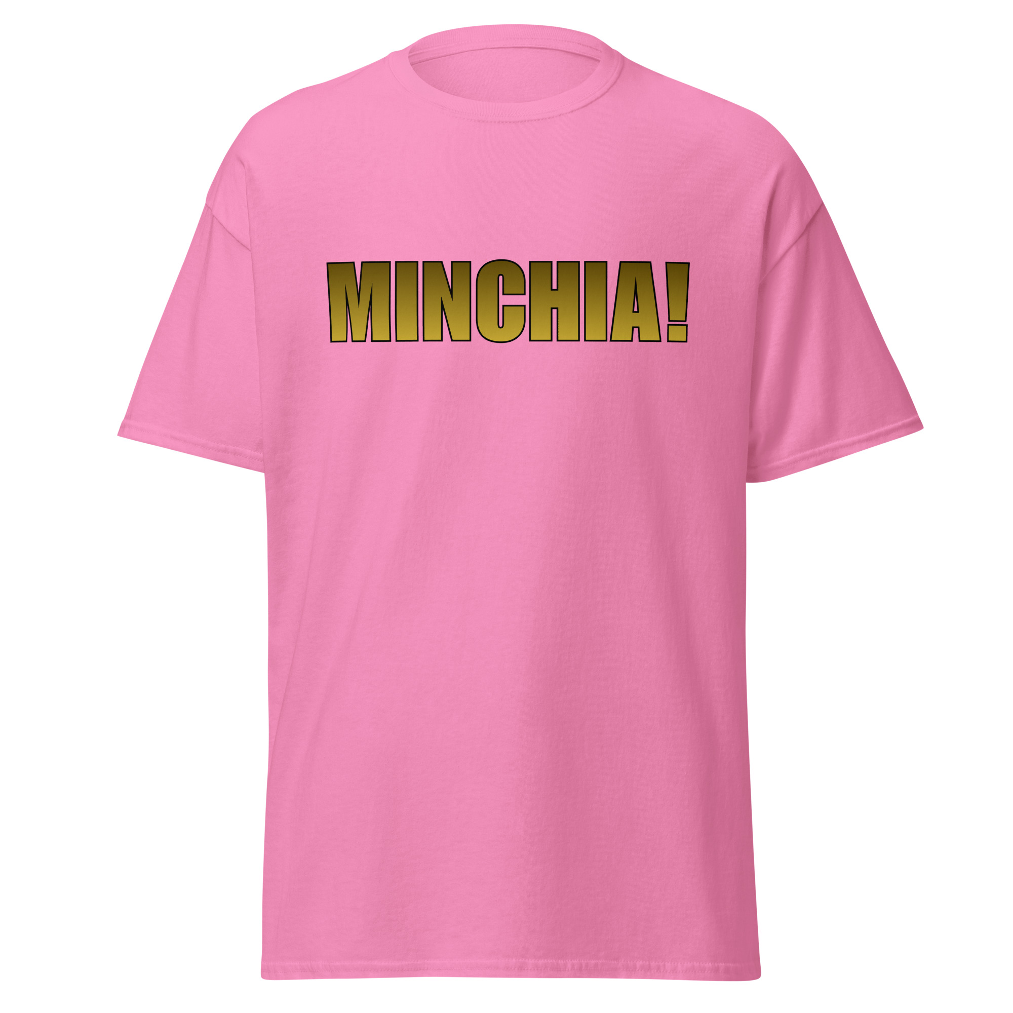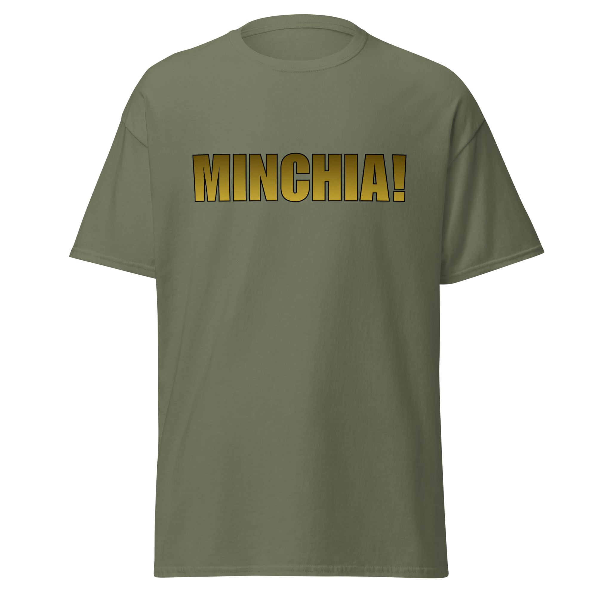 Sul petto, stampata con fierezza e senza censure, l’esclamazione “MINCHIA!”.