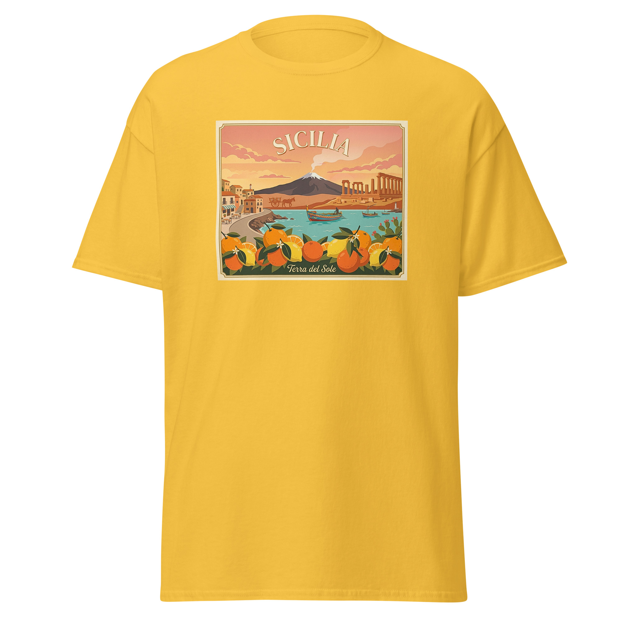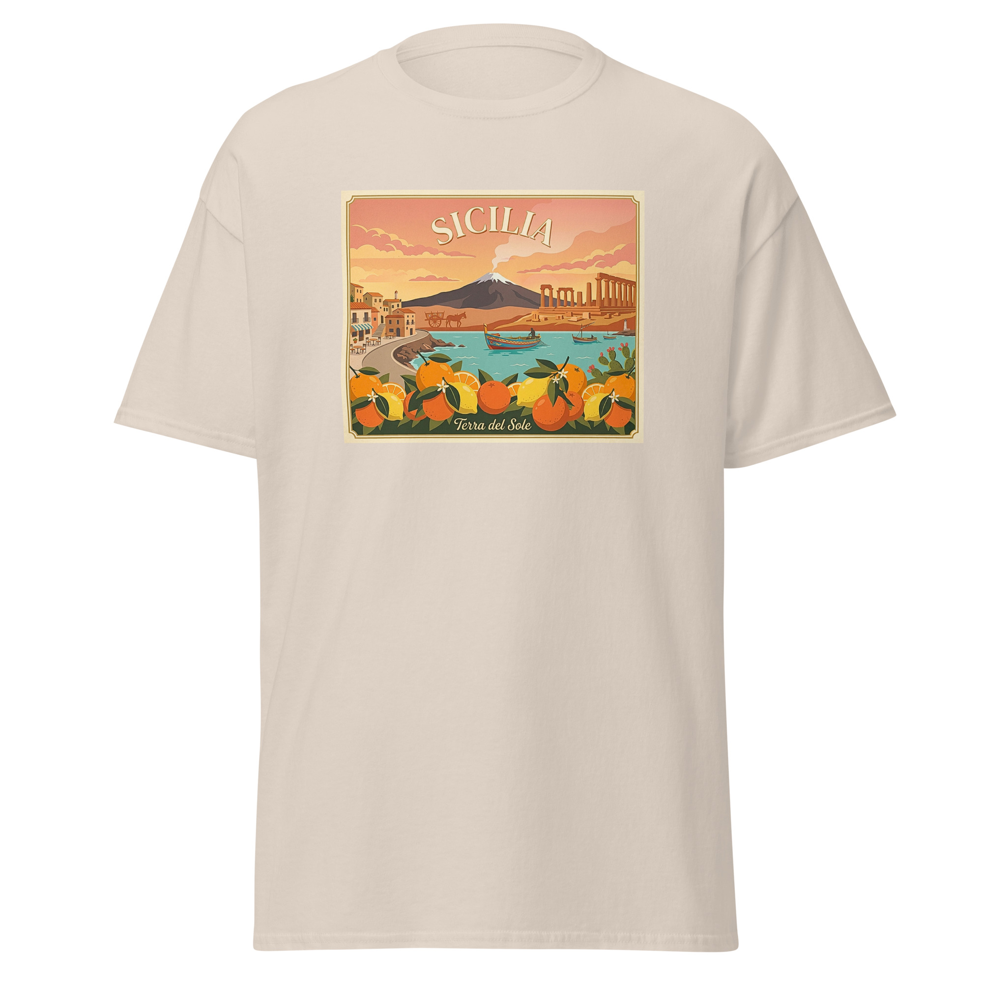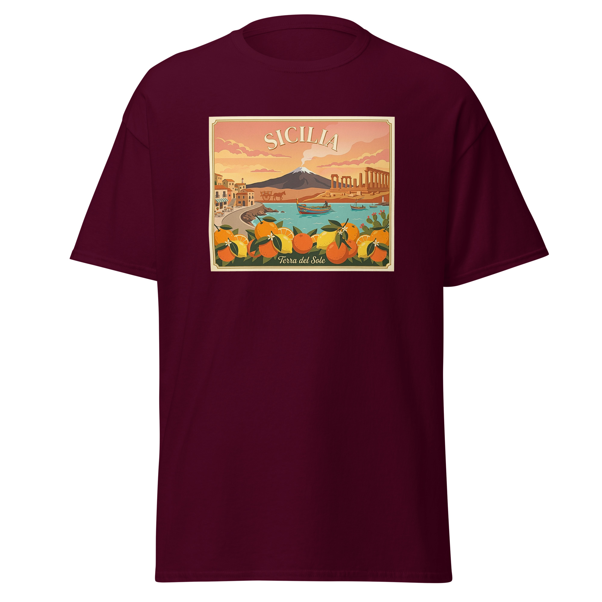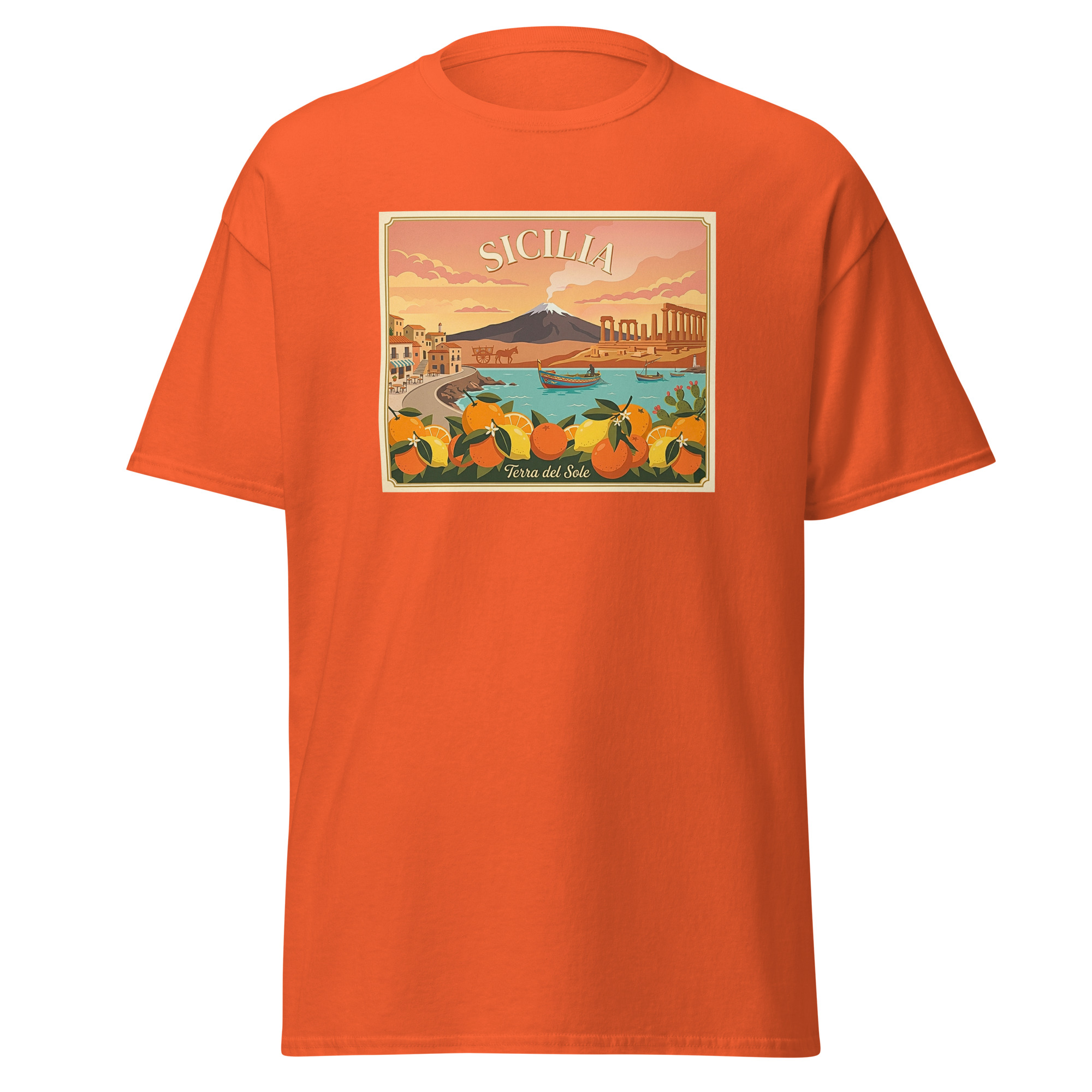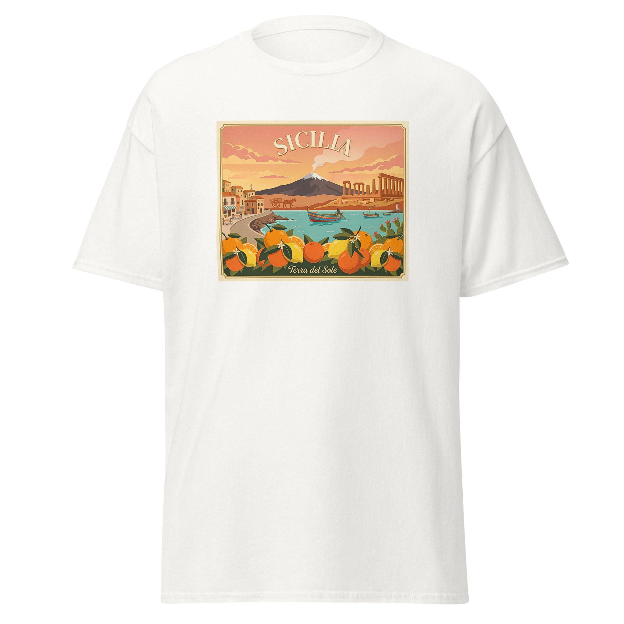 Nessun’altra isola al mondo ha tutto questo nello stesso posto. Il fuoco e l’acqua. L’antico e il selvaggio. Il profumo degli agrumi e il rombo del vulcano. La pietra dei templi e il sale del mare. Questa t-shirt porta addosso quella contraddizione magnifica che solo chi è siciliano può capire davvero.