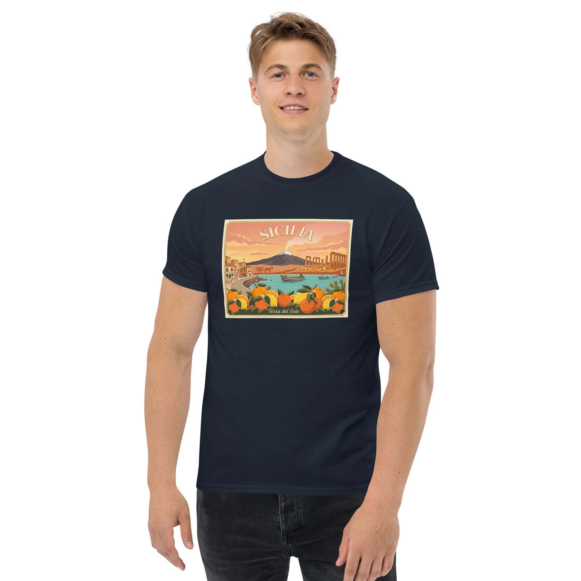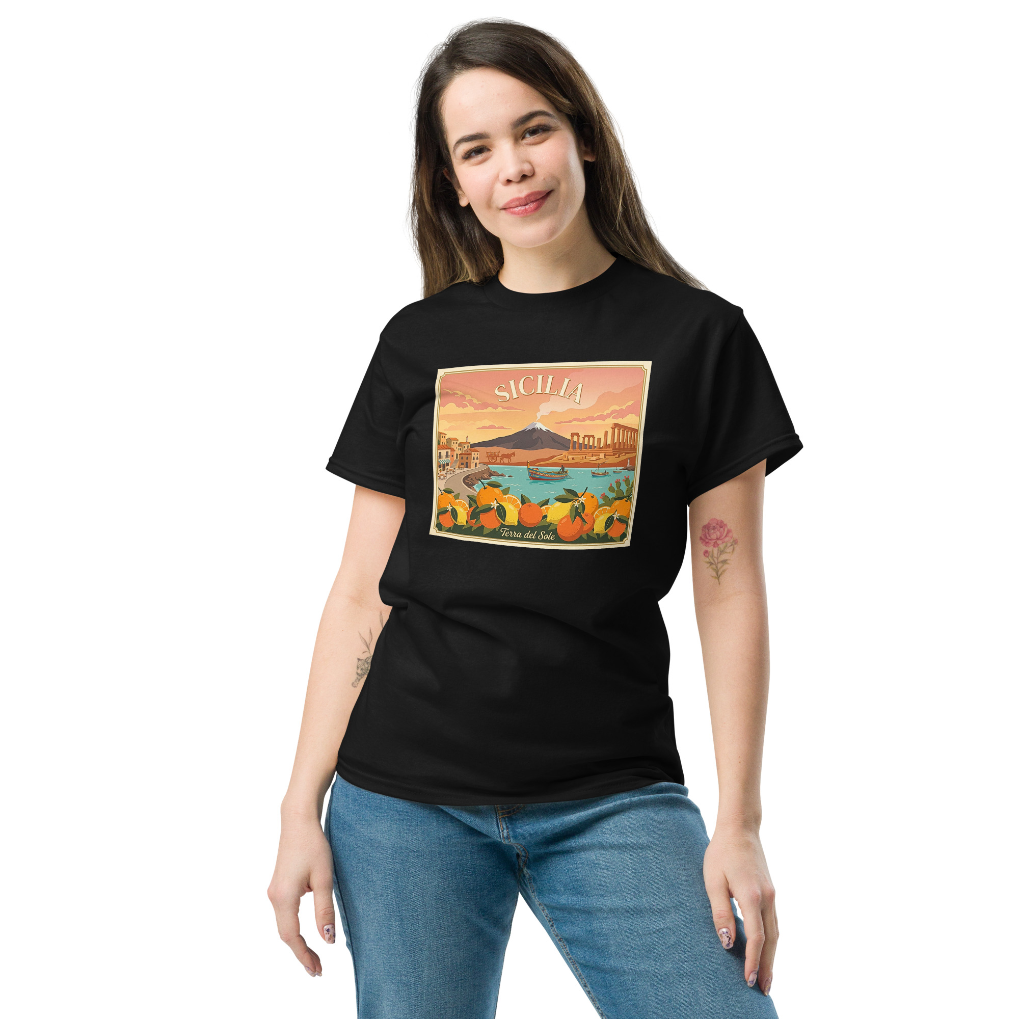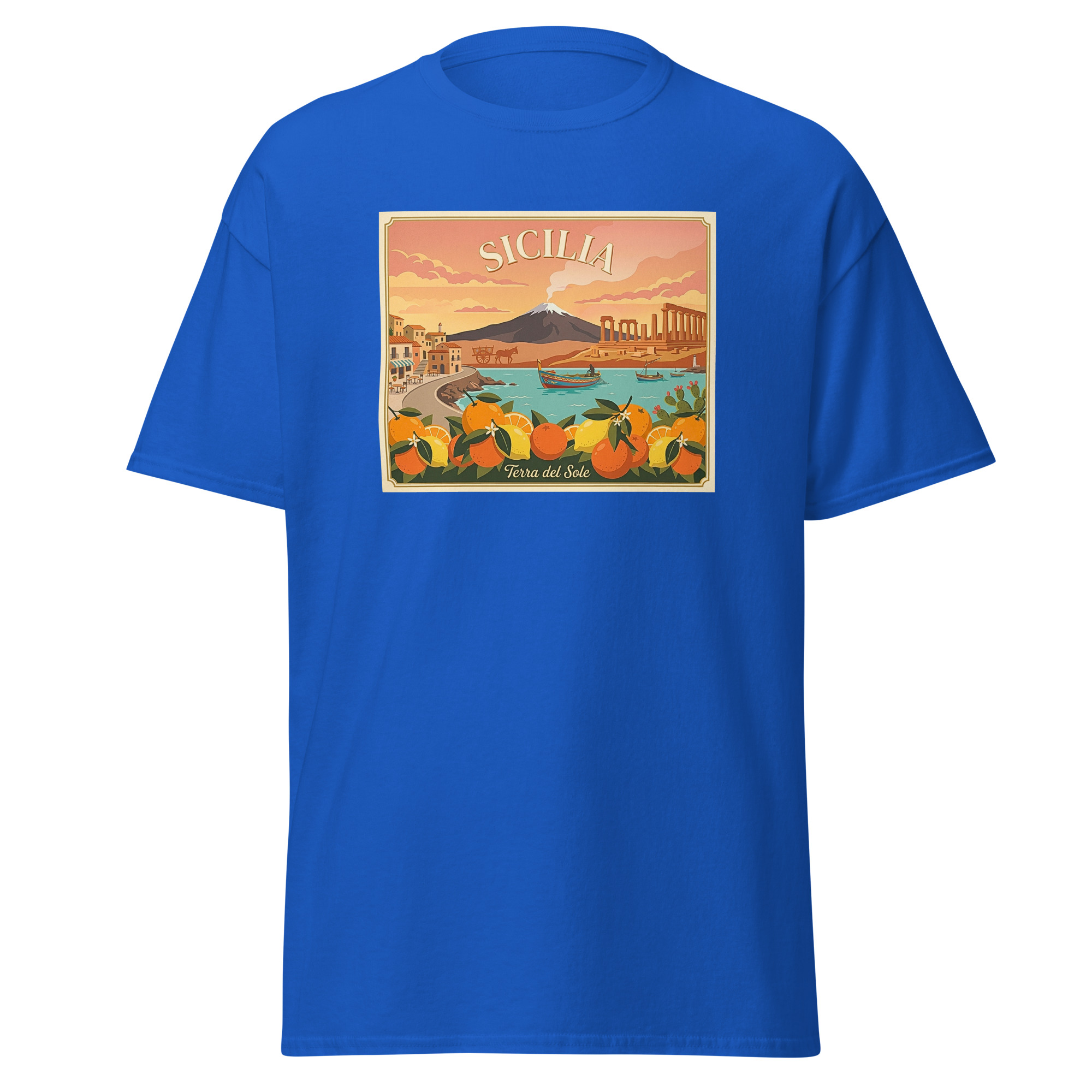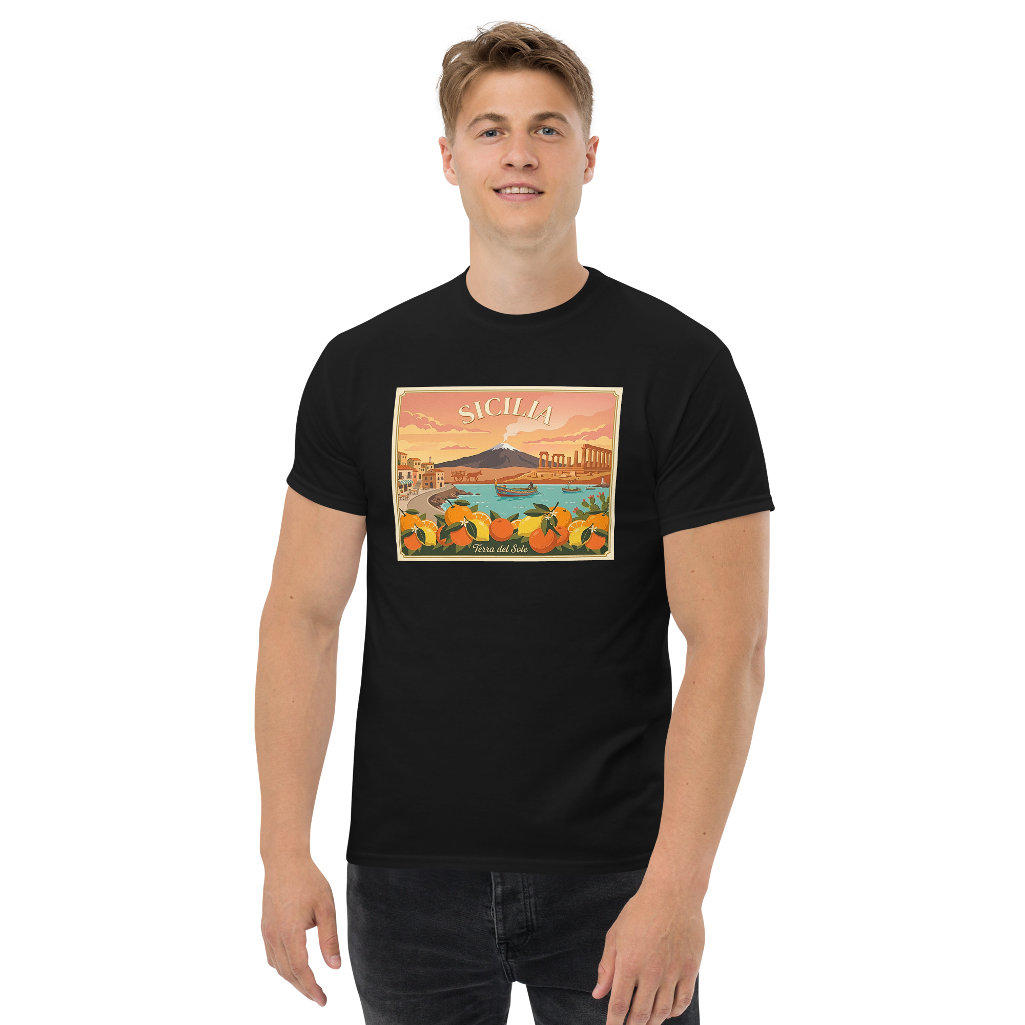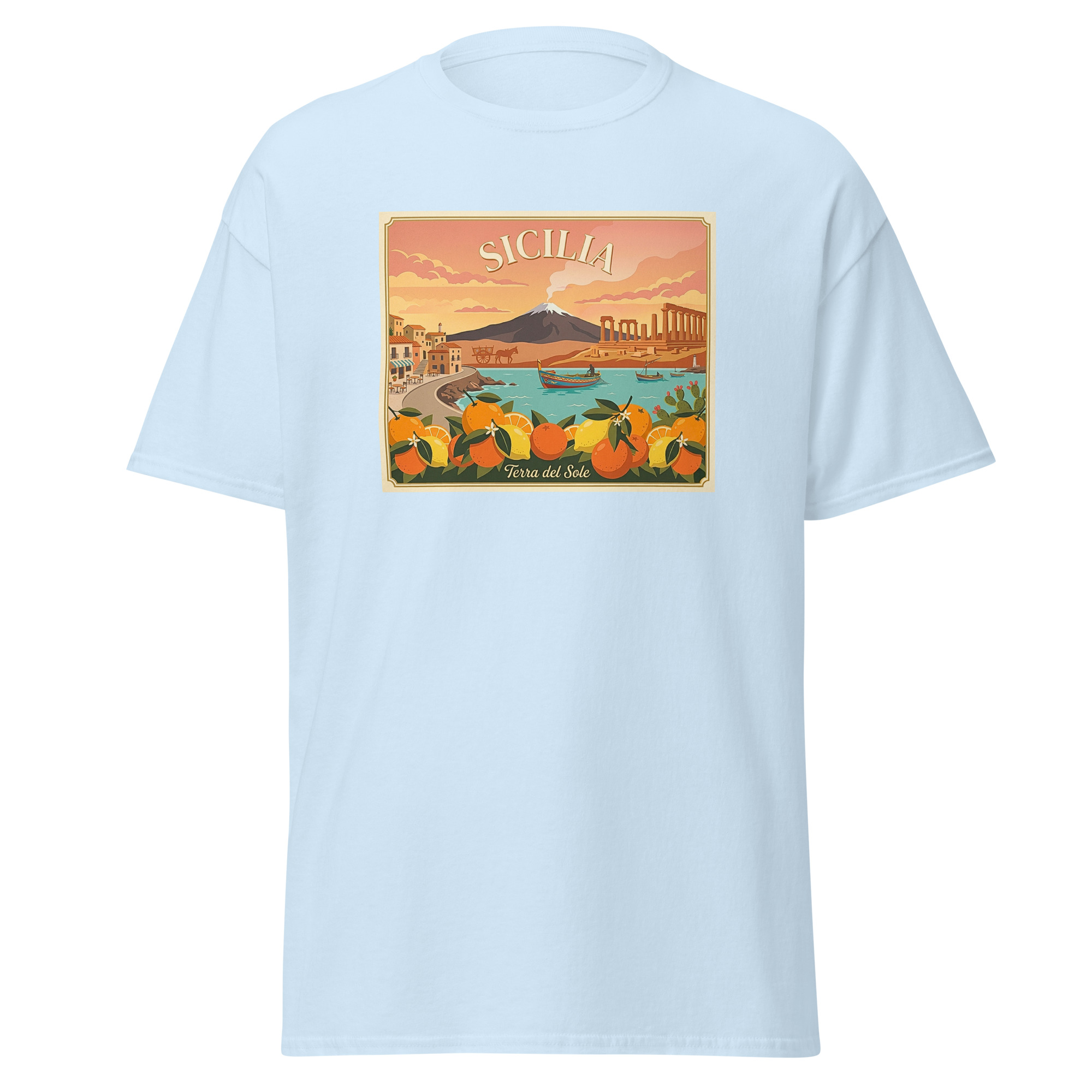 Nessun’altra isola al mondo ha tutto questo nello stesso posto. Il fuoco e l’acqua. L’antico e il selvaggio. Il profumo degli agrumi e il rombo del vulcano. La pietra dei templi e il sale del mare. Questa t-shirt porta addosso quella contraddizione magnifica che solo chi è siciliano può capire davvero.