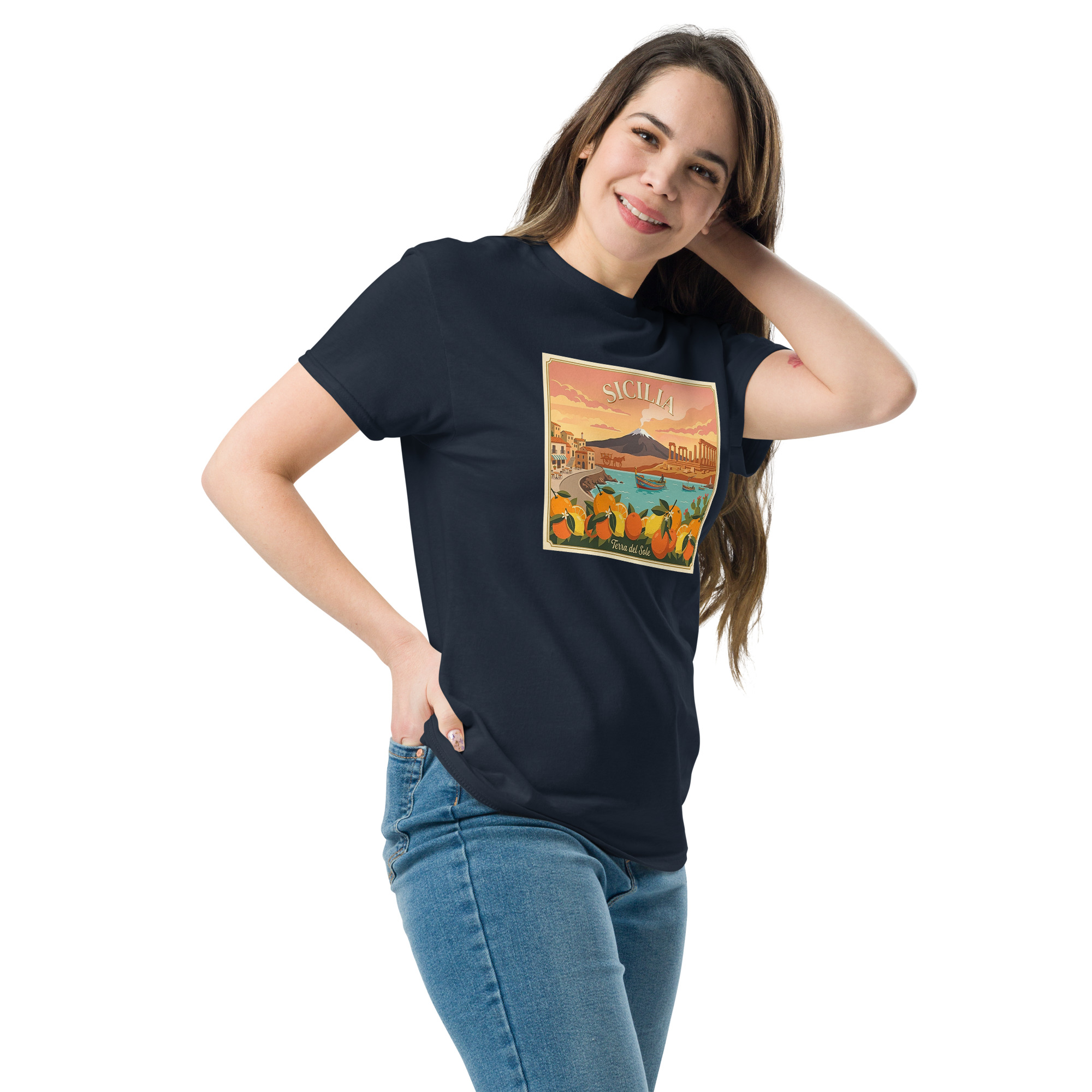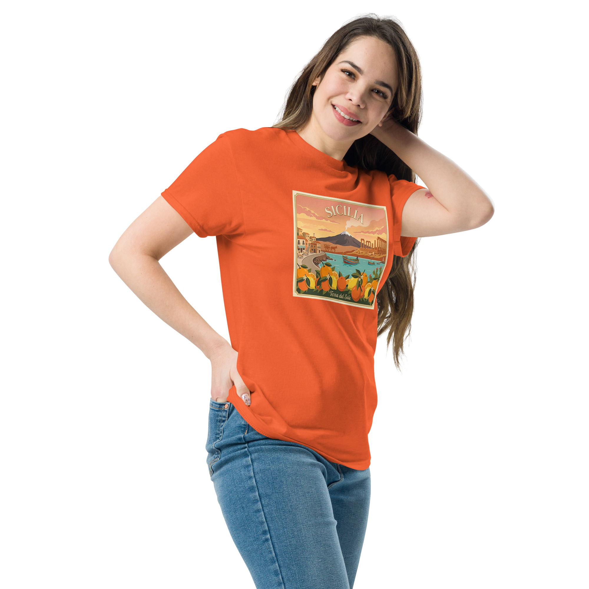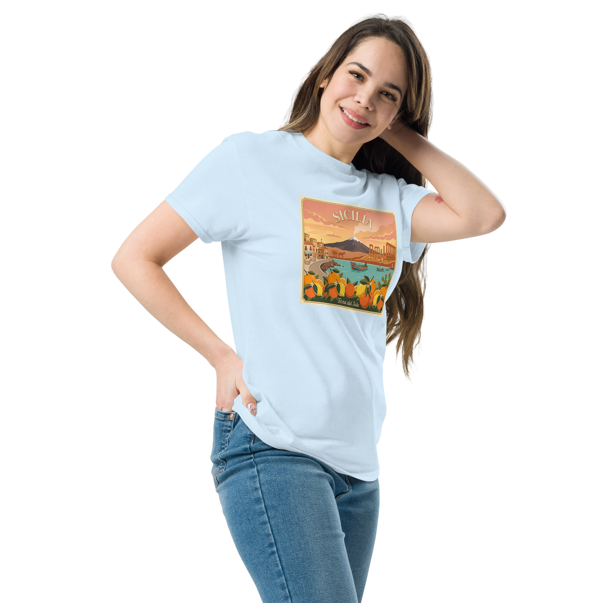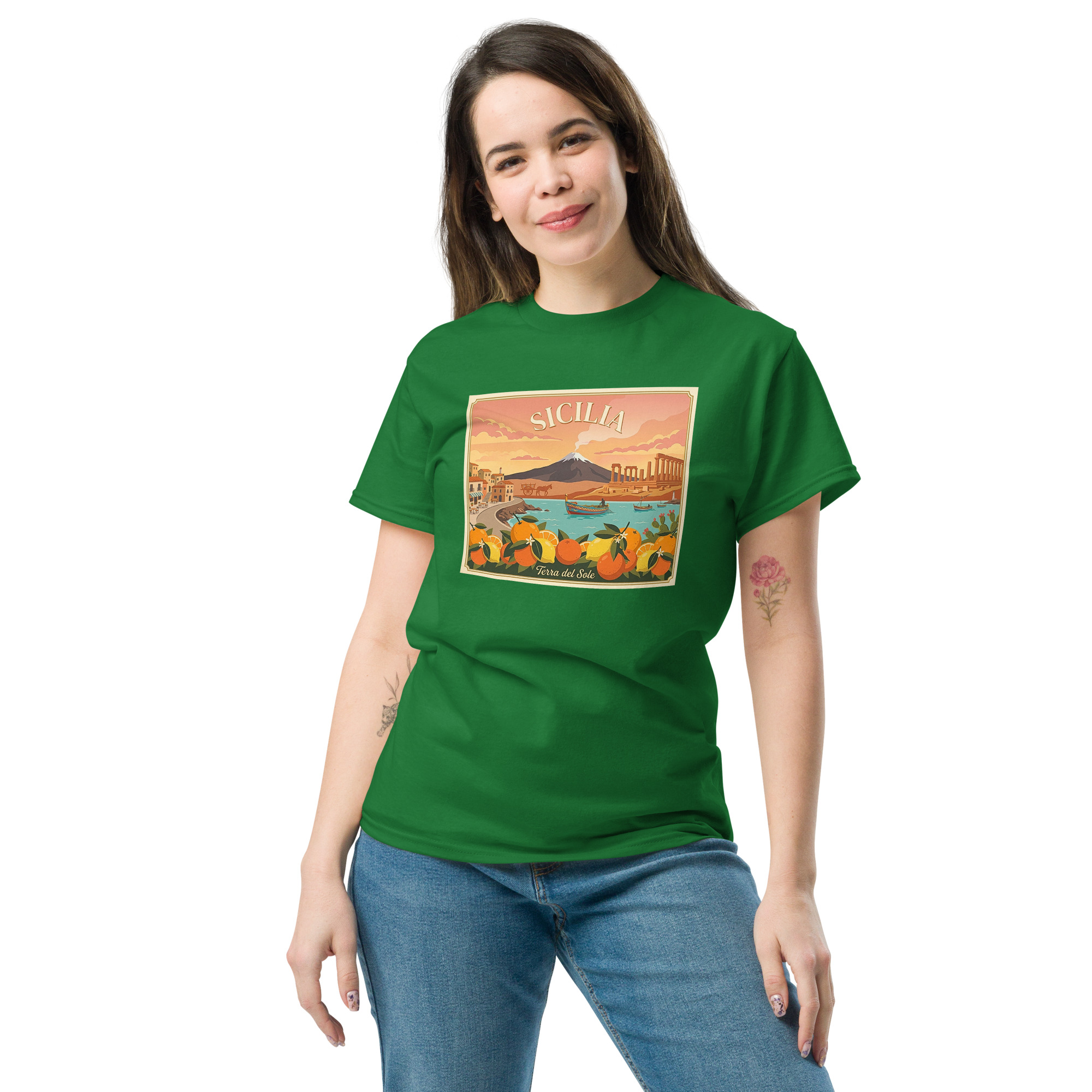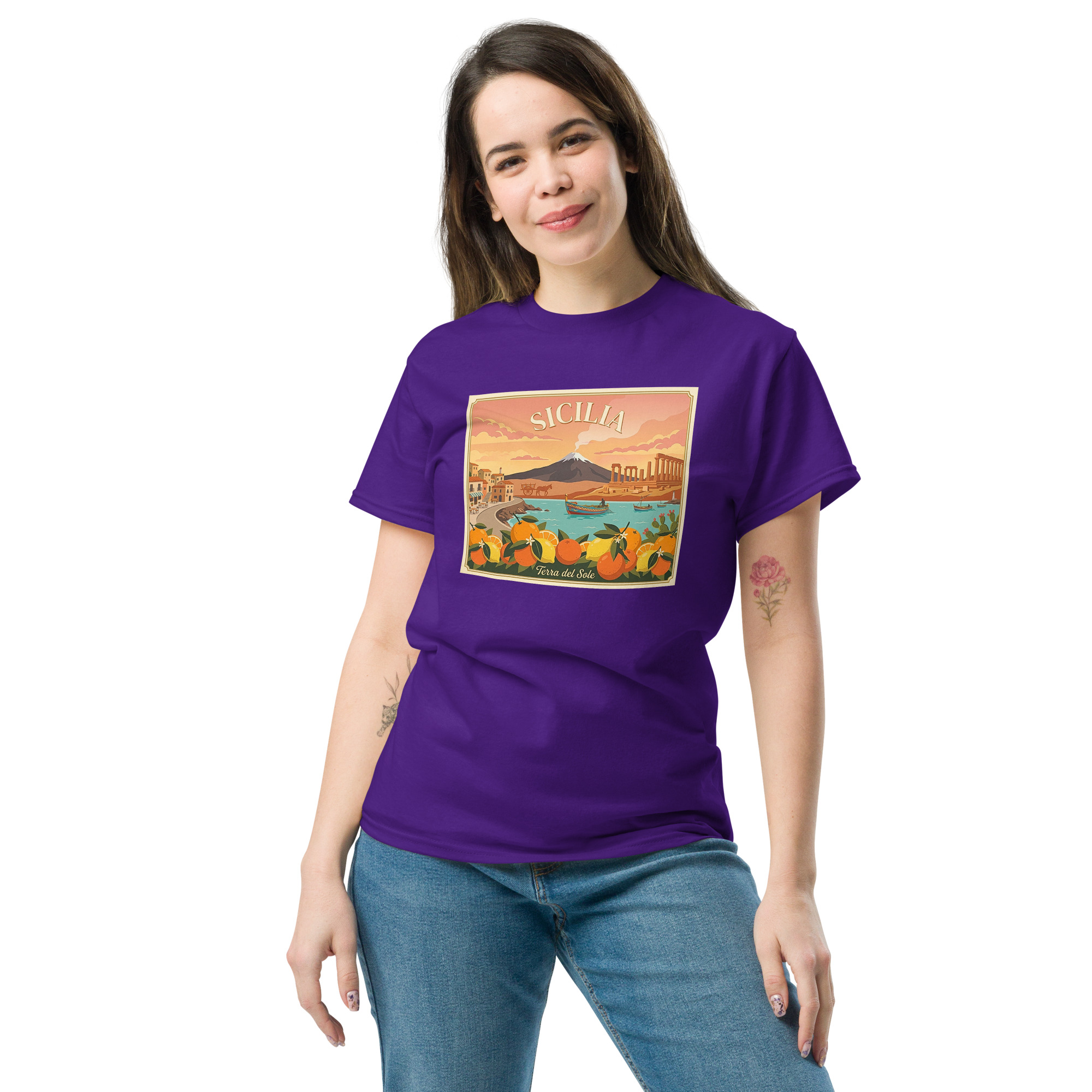 Nessun’altra isola al mondo ha tutto questo nello stesso posto. Il fuoco e l’acqua. L’antico e il selvaggio. Il profumo degli agrumi e il rombo del vulcano. La pietra dei templi e il sale del mare. Questa t-shirt porta addosso quella contraddizione magnifica che solo chi è siciliano può capire davvero.